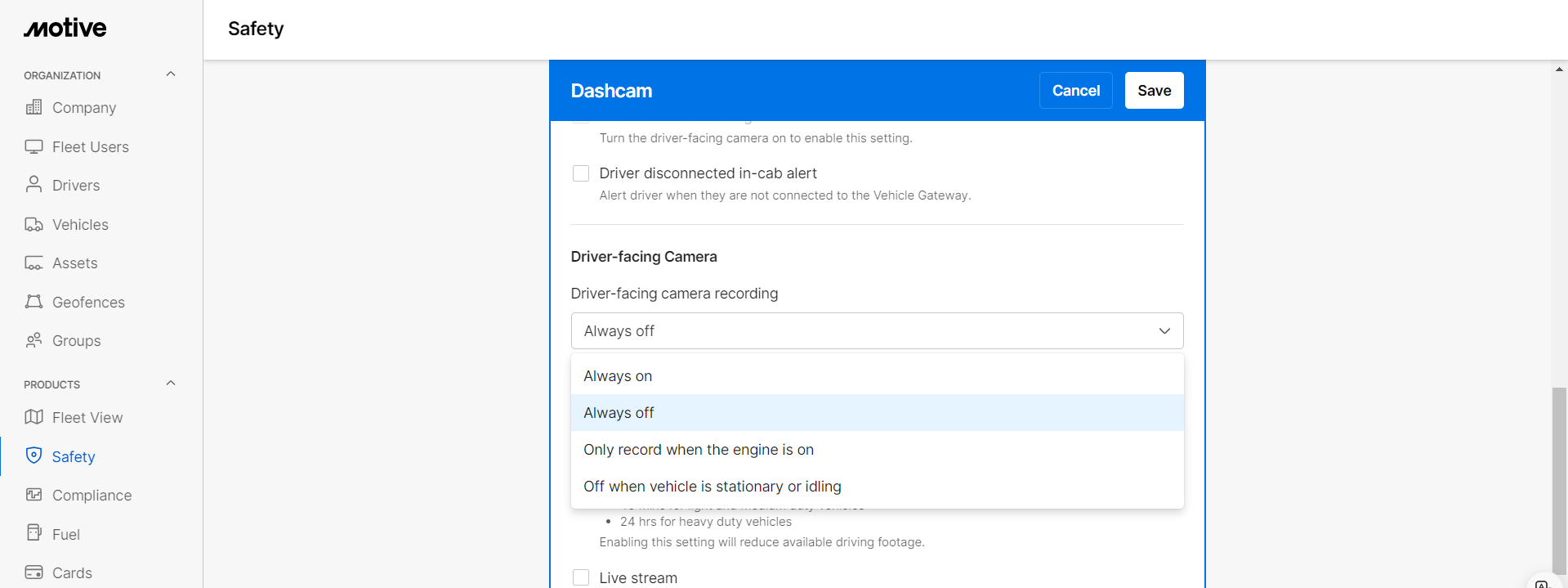 - Fleets have multiple options to configure the Driver-facing camera. These options include continuous camera recording, disabling the camera entirely, and disabling the camera for specific conditions to maintain Driver privacy (e.g. when the engine is off, or while the engine is on but the vehicle is stationary).