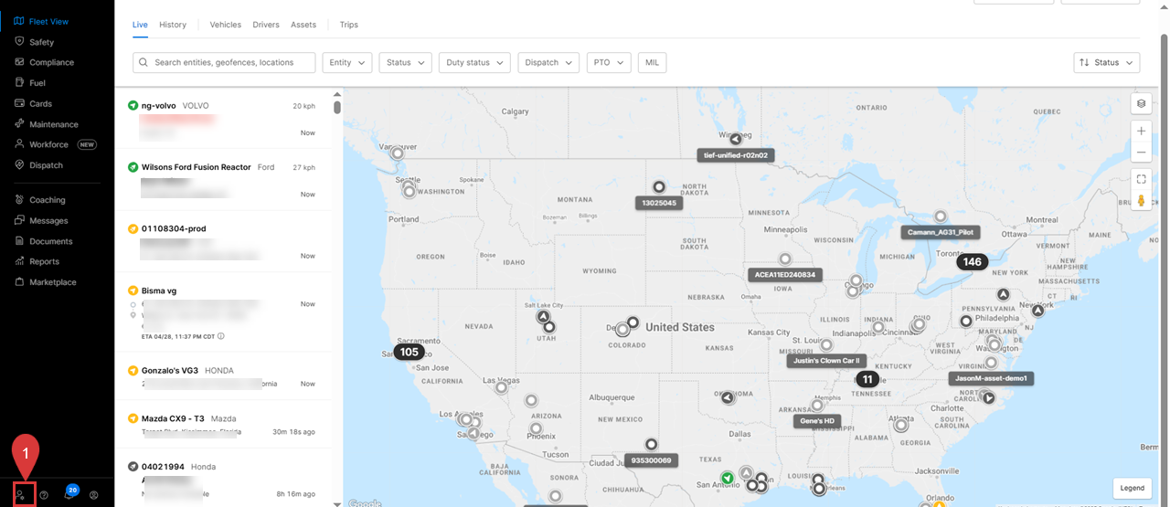 1. Log in to the Motive Fleet Dashboard and click the Admin icon in the bottom left corner.