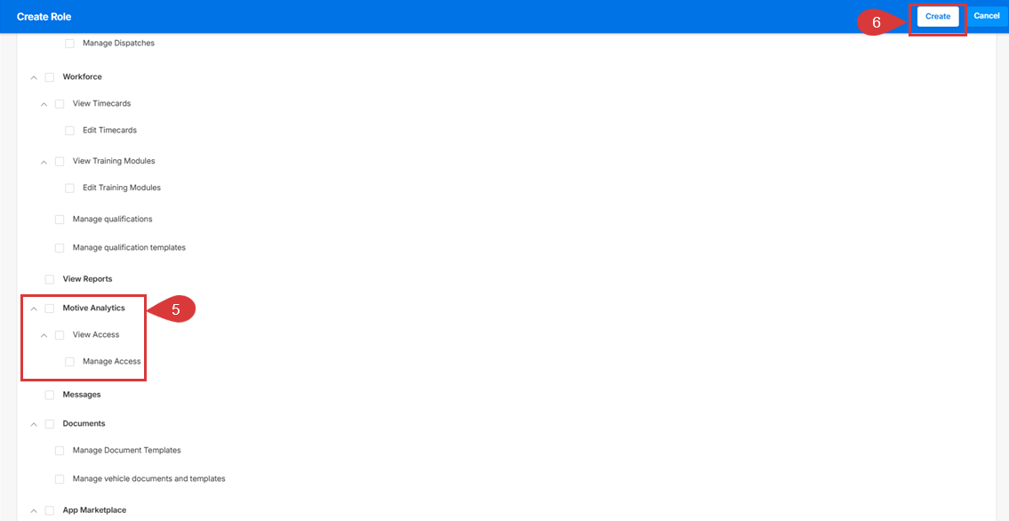 5. Scroll down to the Motive Analytics section in the Create Role screen. Choose View Access for users who need to explore pre-built reports or Manage Access for those who create and customise new content.