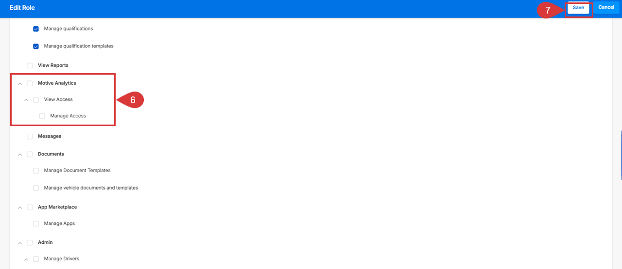 6. Scroll down to the Motive Analytics section in the Edit Role screen. Choose View Access for users who need to explore pre-built reports or Manage Access for those who will create and customise new content.