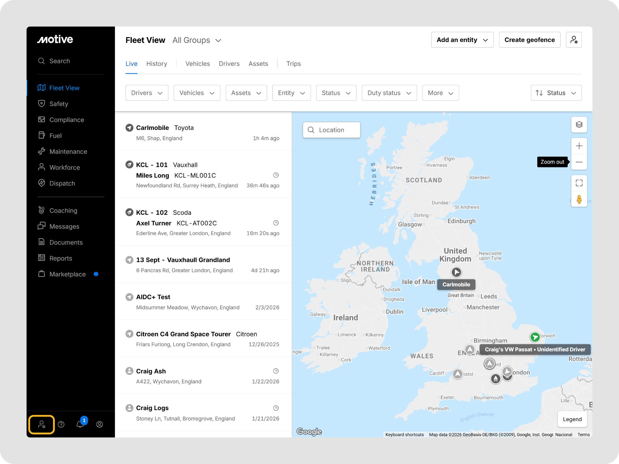 The Admin section in the Motive Dashboard allows authorised fleet users to manage drivers, vehicles, assets, and settings for compliance, safety, maintenance, and other areas of the product.