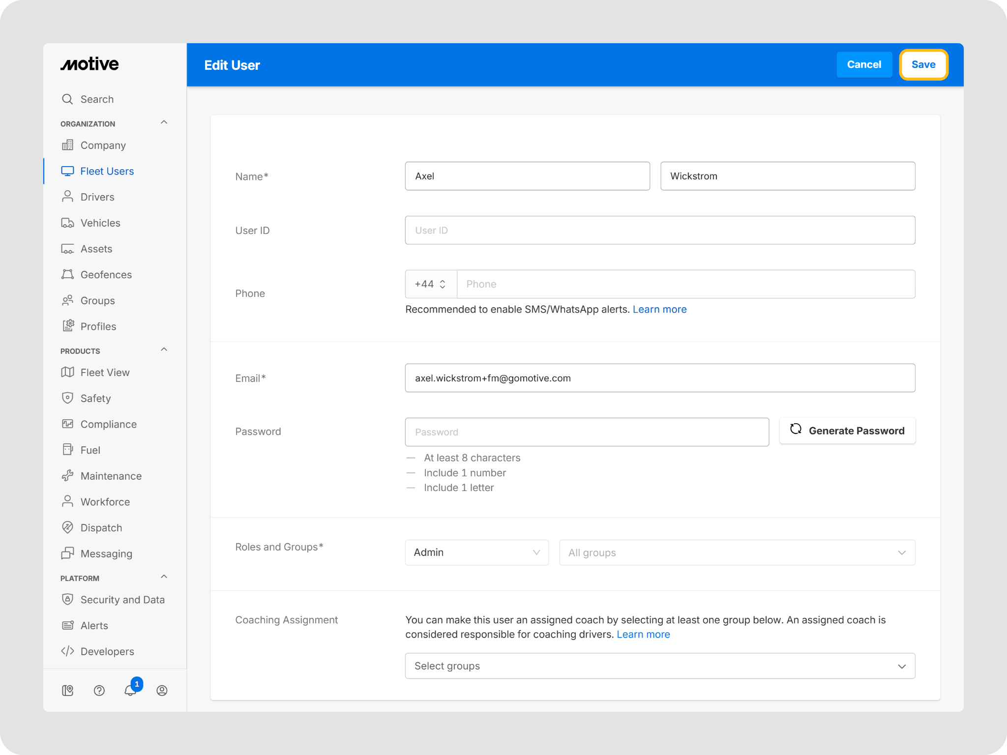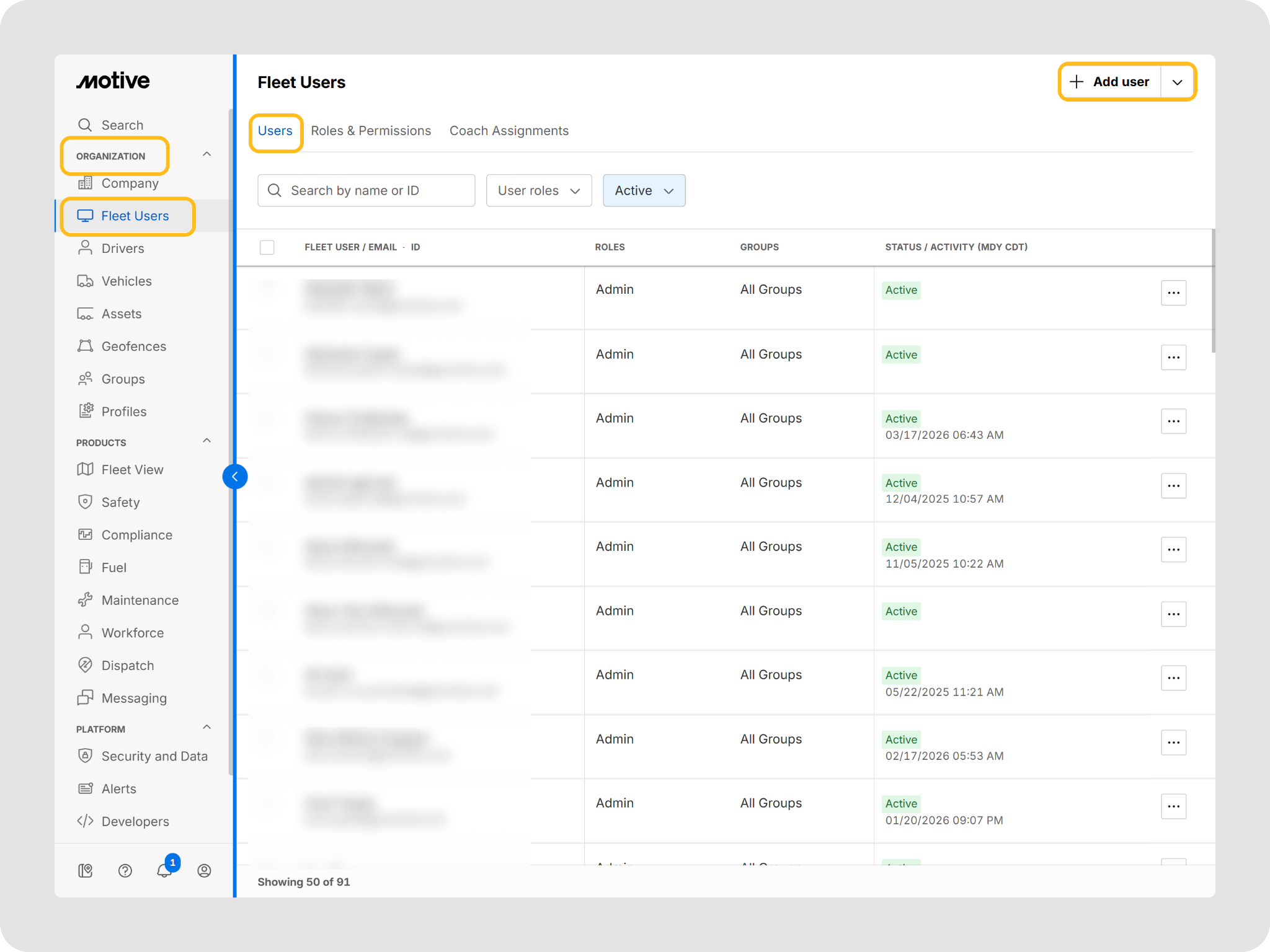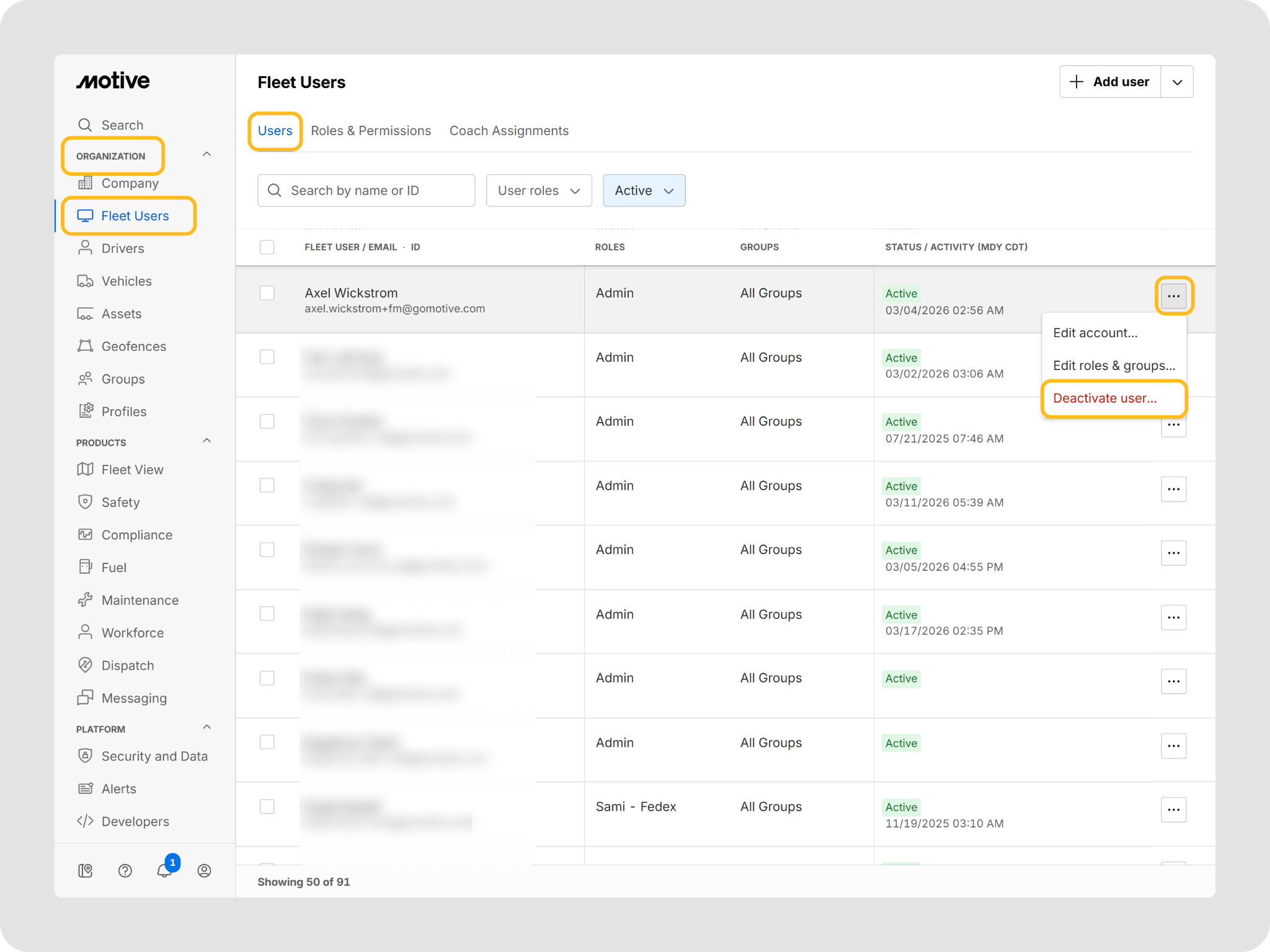 Access a complete trail of all admin changes performed by fleet users on a Motive account for auditing reasons.