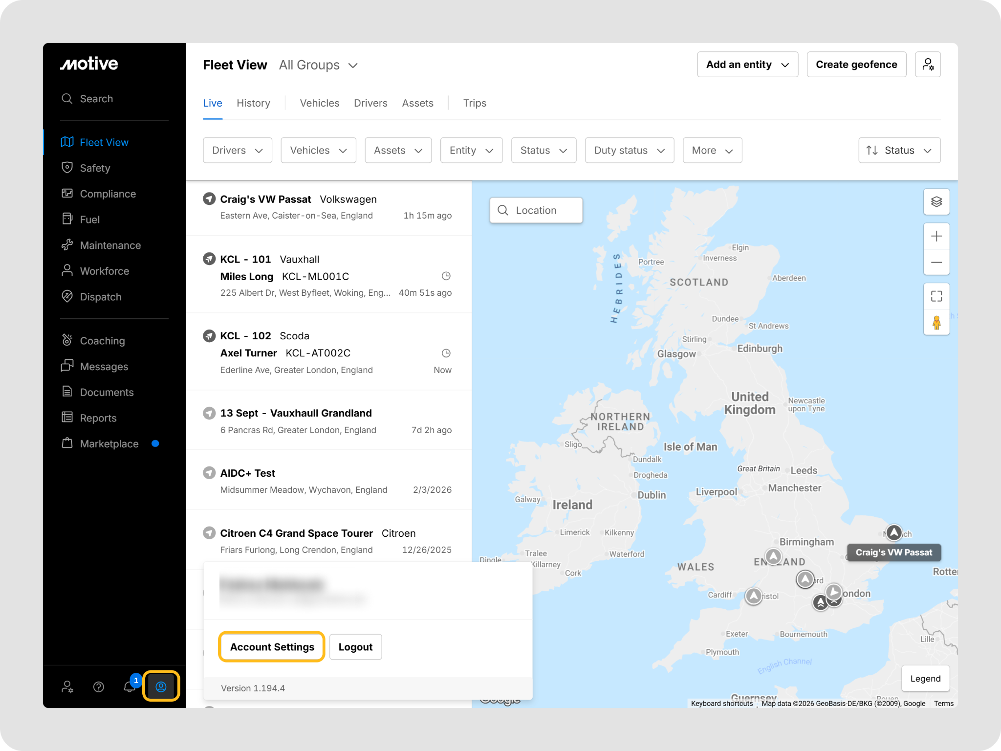 - Log in to the Motive Fleet dashboard and click the Profile icon > Account Settings.