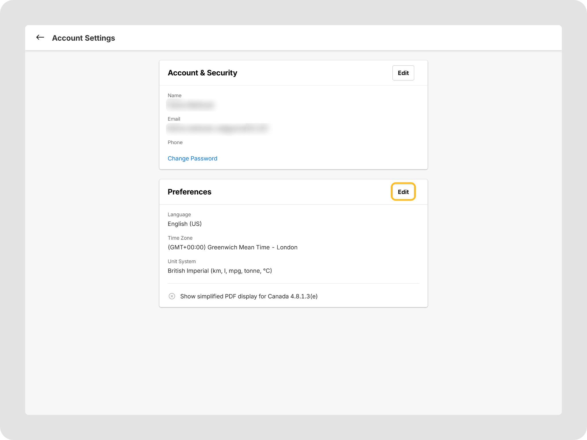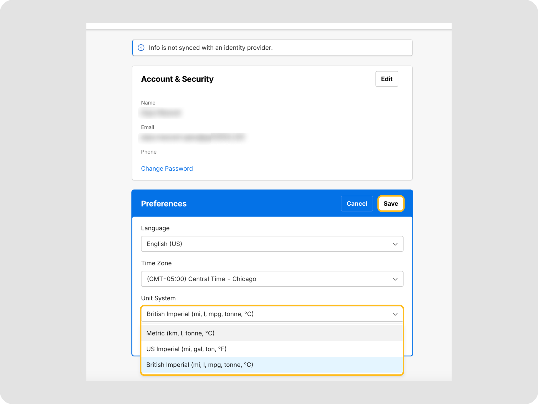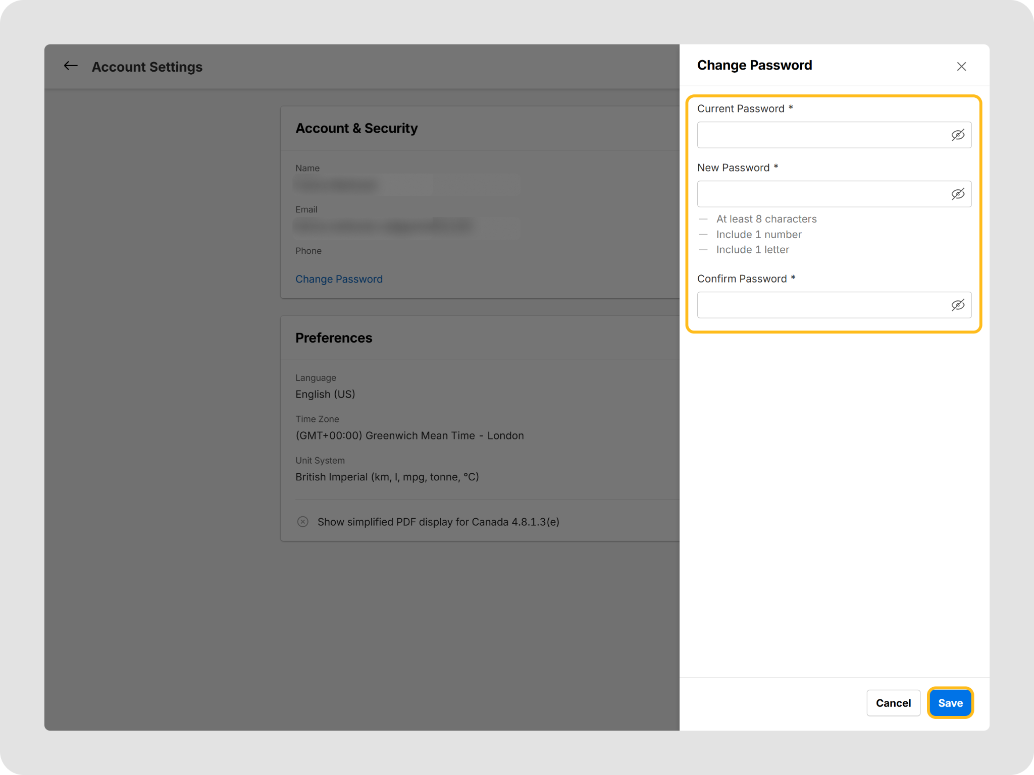 Fleet admins can access and update account settings such as account name, email, password, language, time zone, and speed unit system from the Fleet Dashboard.