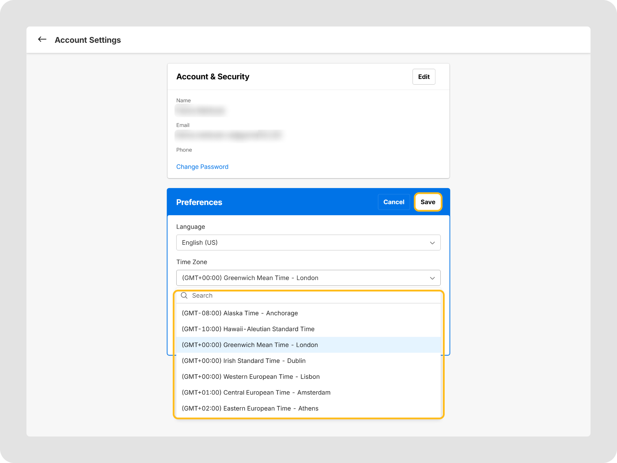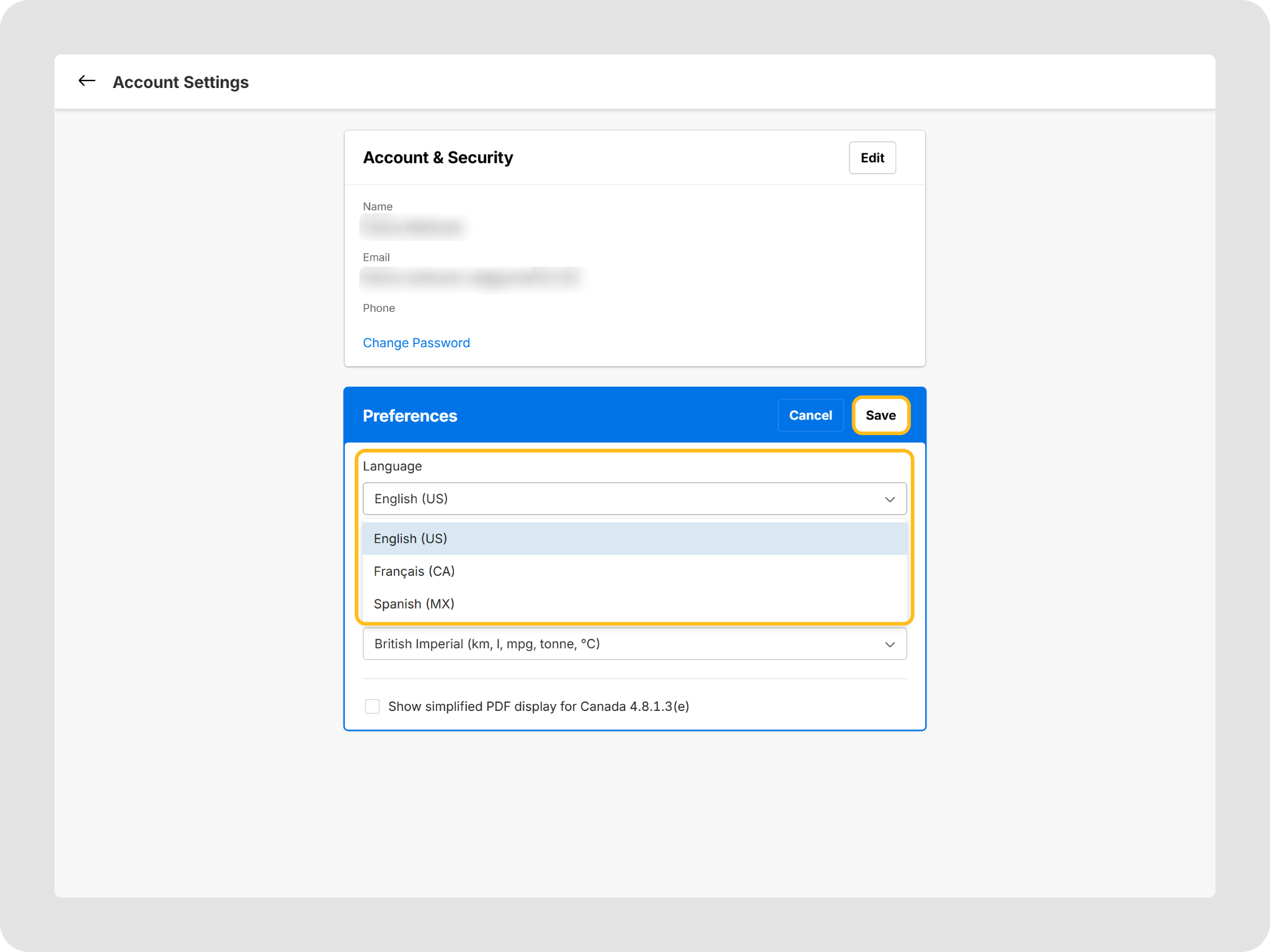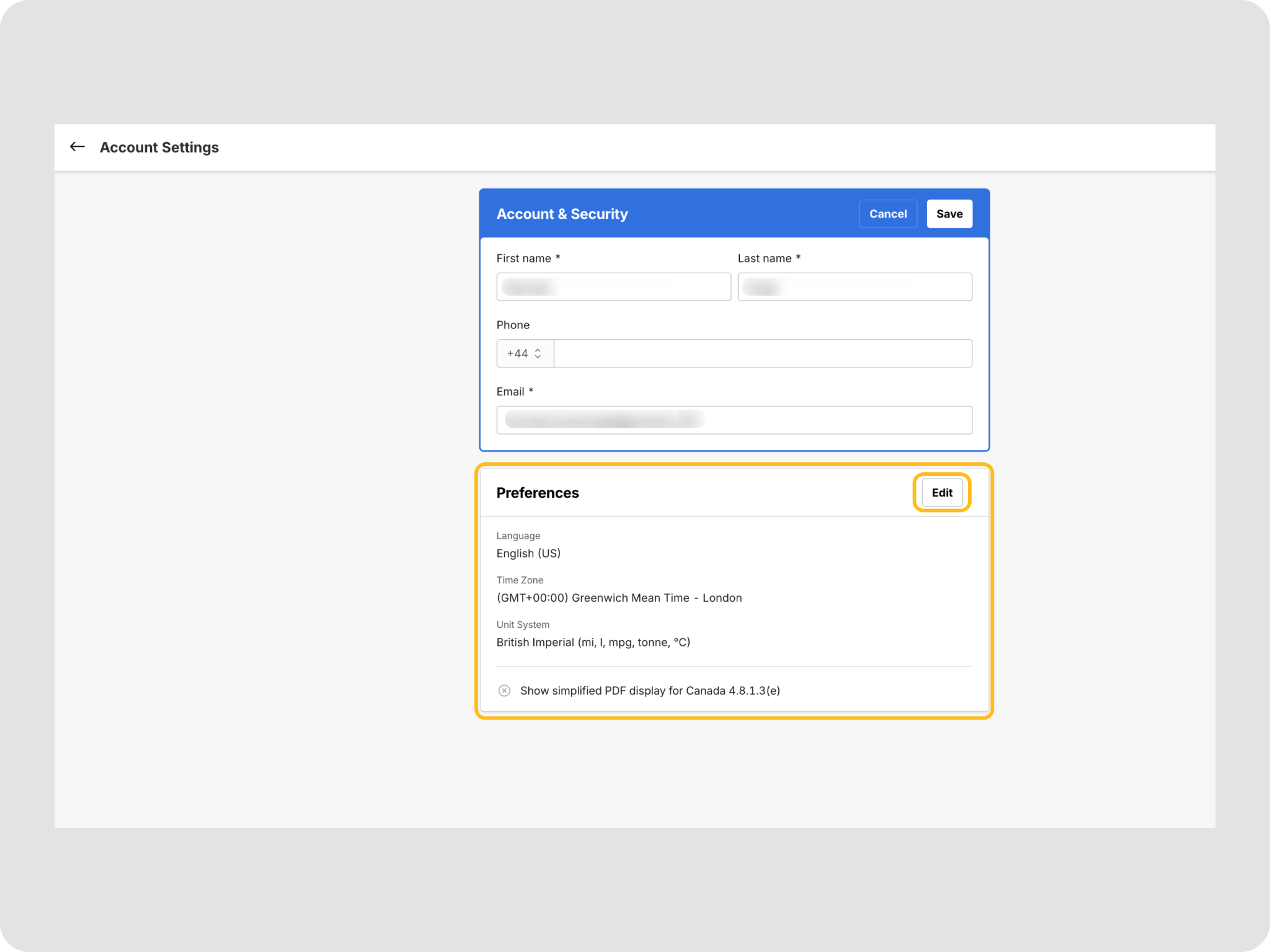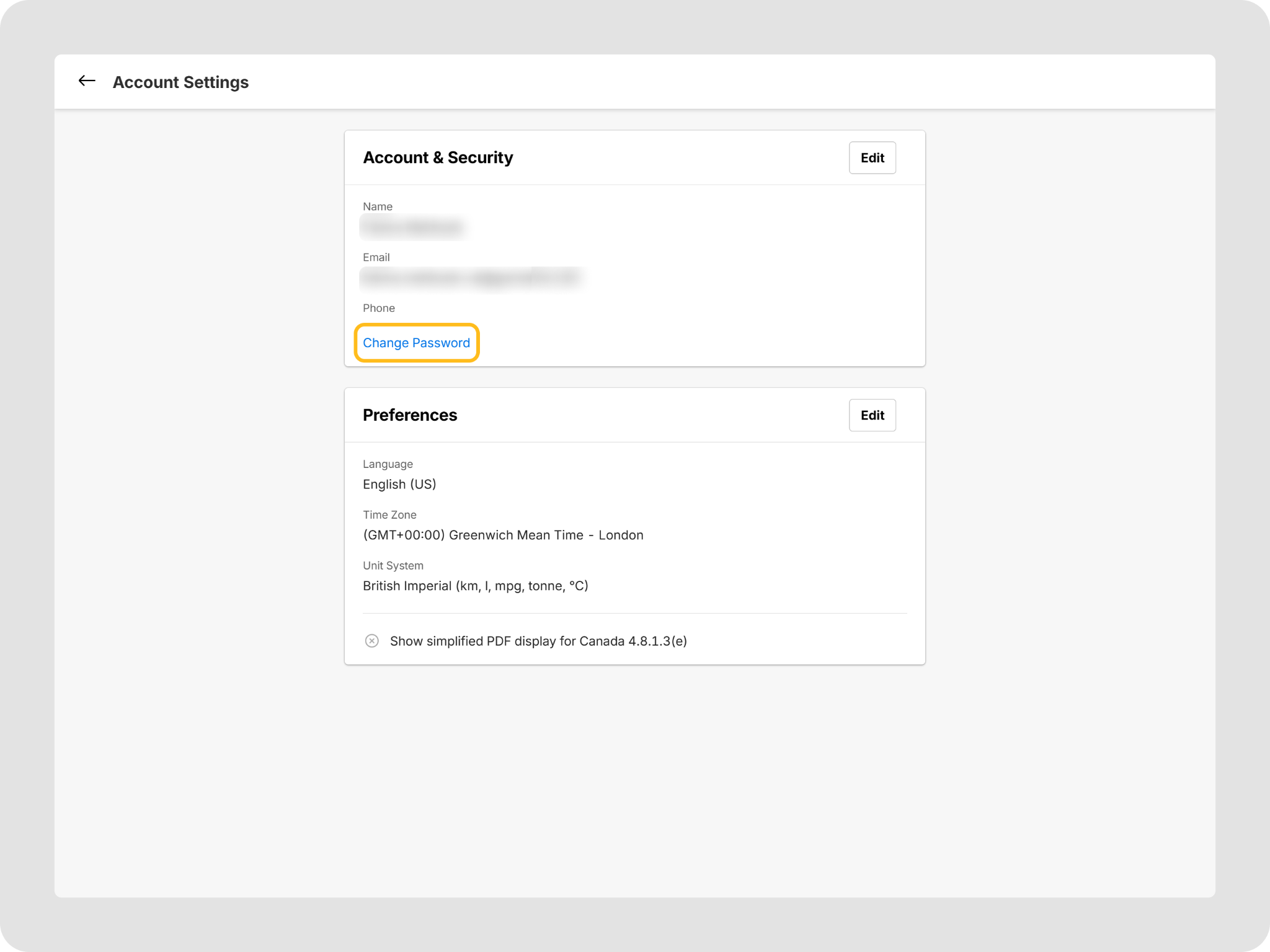 Fleet admins can access and update account settings such as account name, email, password, language, time zone, and speed unit system from the Fleet Dashboard.