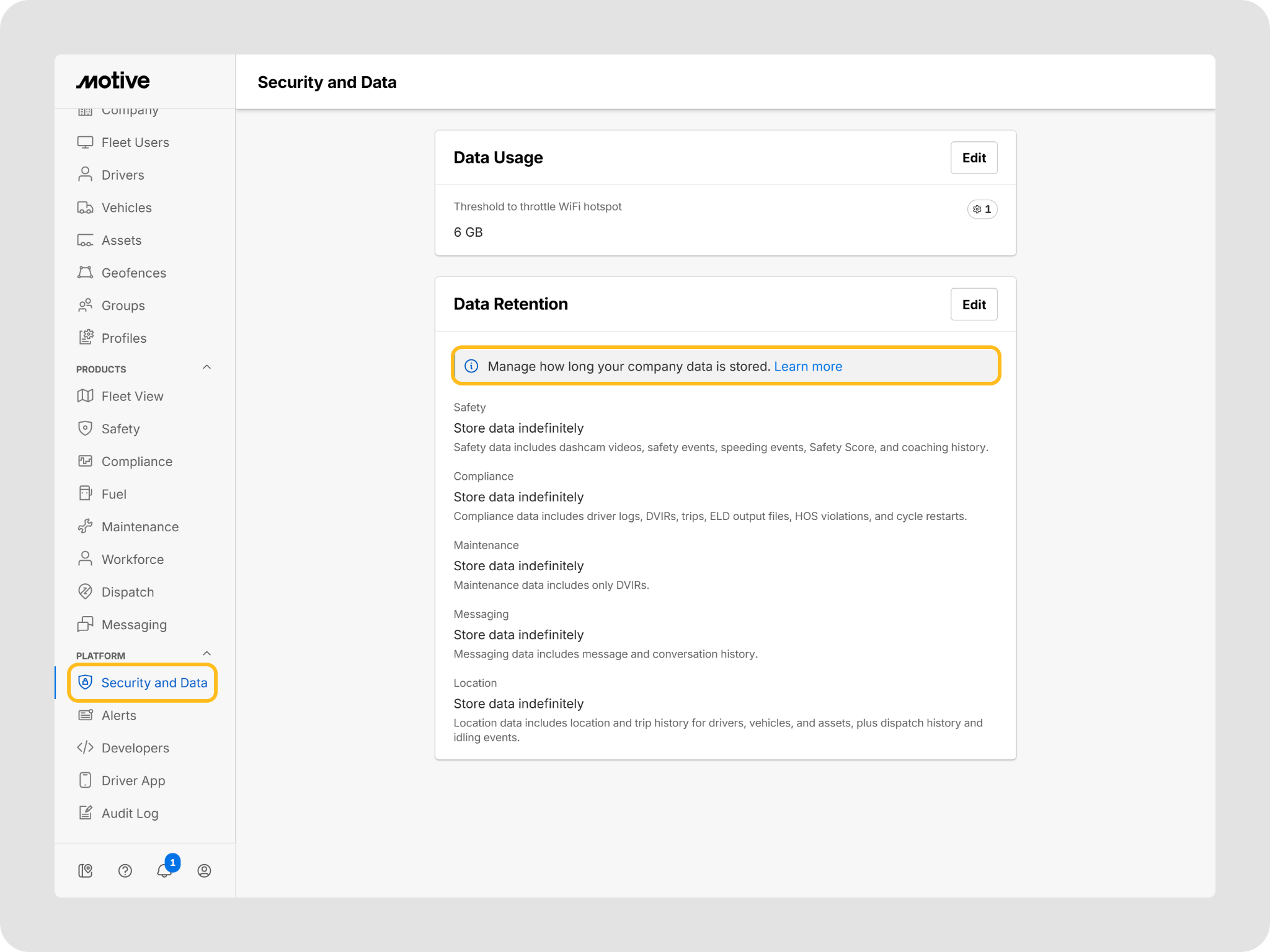 Fleet Admins can edit their data retention settings by reaching out to Motive Support.