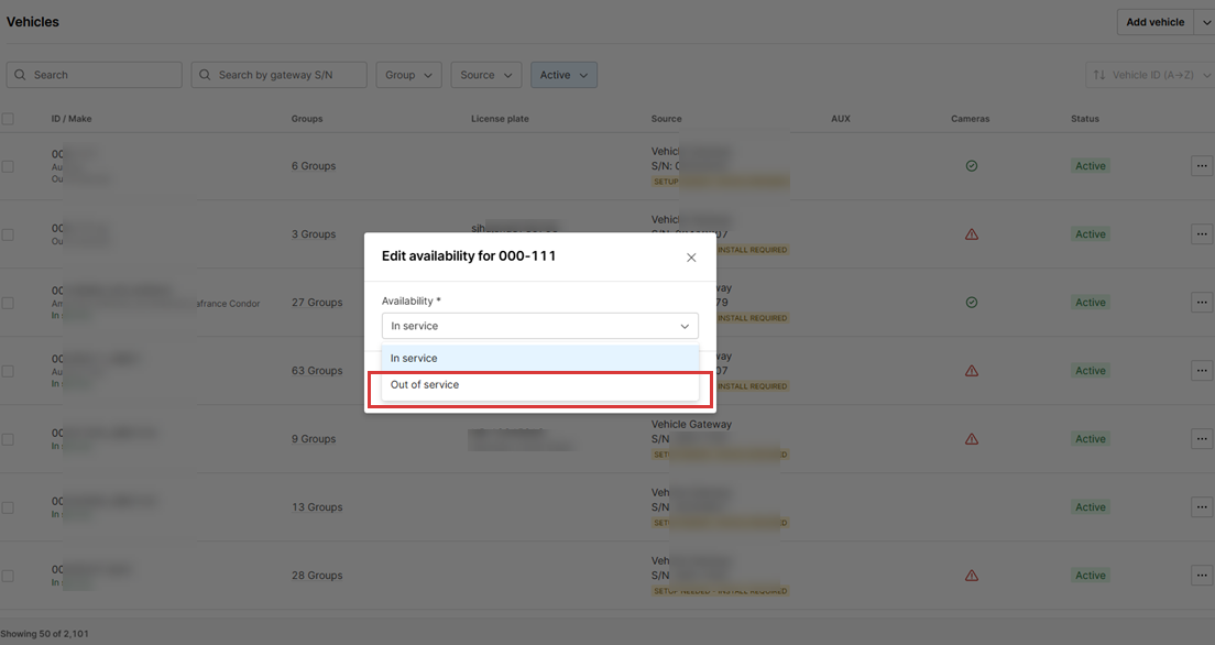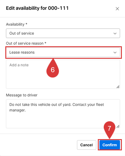 - Click Confirm to save changes. The vehicle is now marked as Out of service.