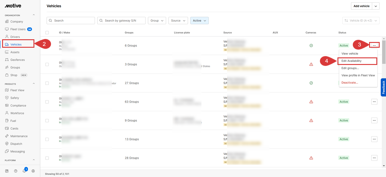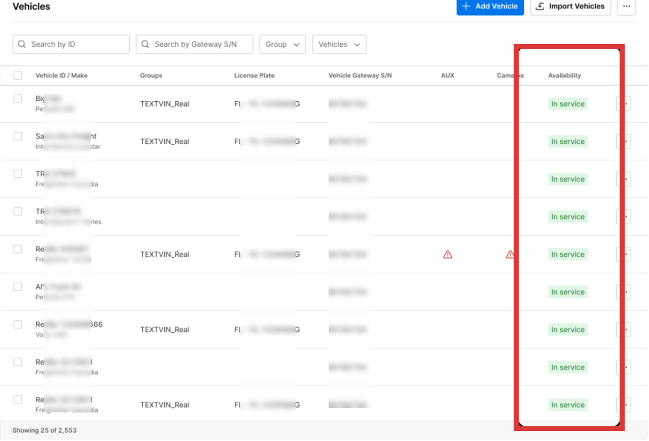 - On the Vehicles page, you can see the Availability status of the vehicle.
