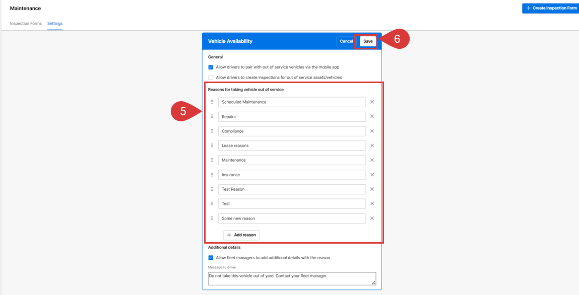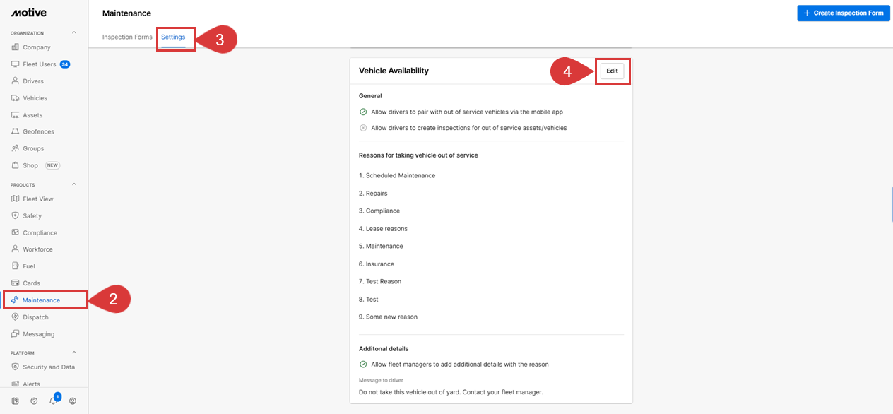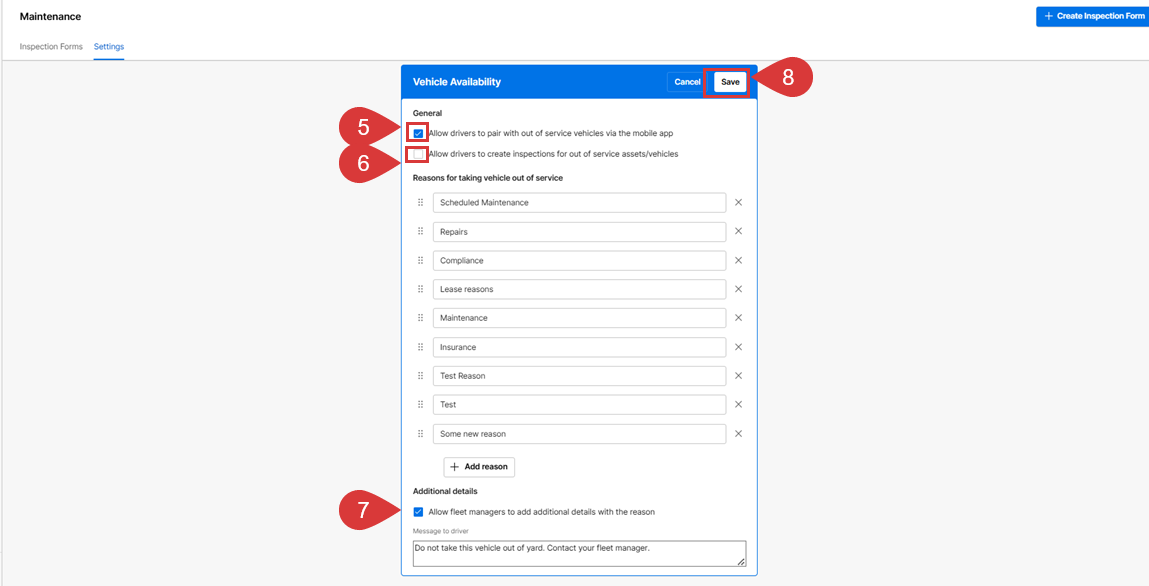- Enable or disable custom messages for Drivers when they attempt to pair or create inspections for an OOS vehicle.