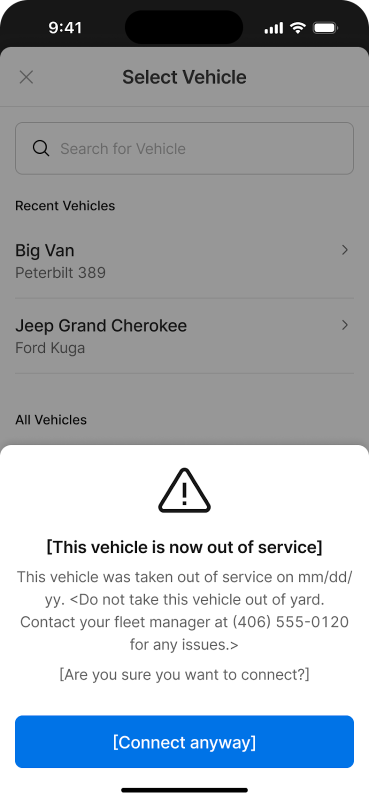 - If messaging is enabled, the custom message displays when a Driver attempts to create an inspection or pair to an OOS vehicle.
