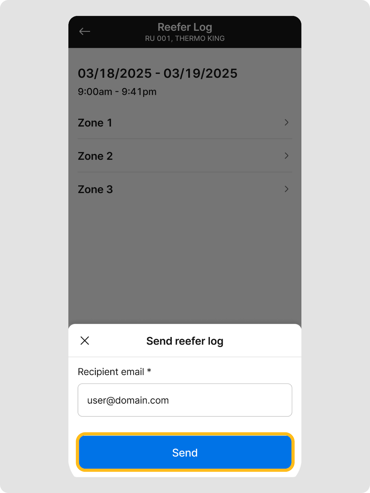 Shared reefer logs include key reefer unit and temperature data for a selected time range. Before sharing the log file, you can tap ‘Reefer unit’ or any one of the listed zones to see the information you are sharing.