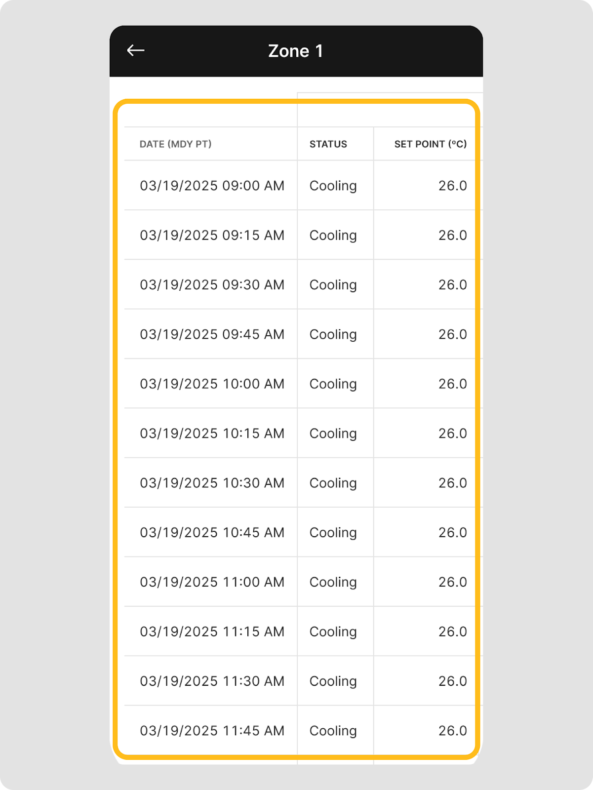 - From the reefer log, tap Reefer unit or any one of the listed zones to view their reefer logs in table view.
