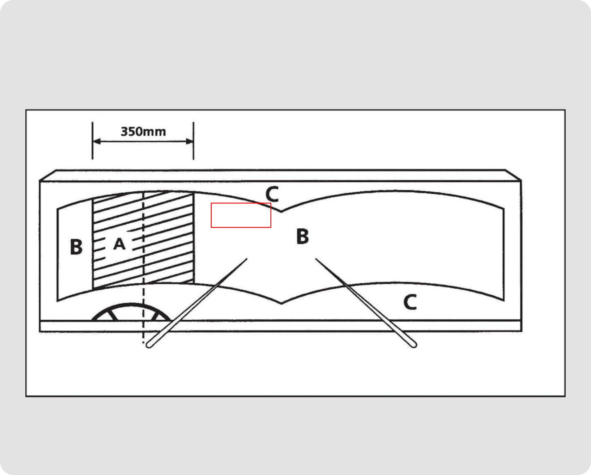 Zone C consists of all parts of the windscreen that fall outside the wiper-swept region. This is the least restrictive area; obstructions are generally acceptable in this zone unless they noticeably limit the driverʼs ability to see the road or surrounding traffic. Throughout all zones, the underlying requirement remains the same: the driver must retain a full, clear view ahead, and anything that restricts that visibility can be considered non-compliant.