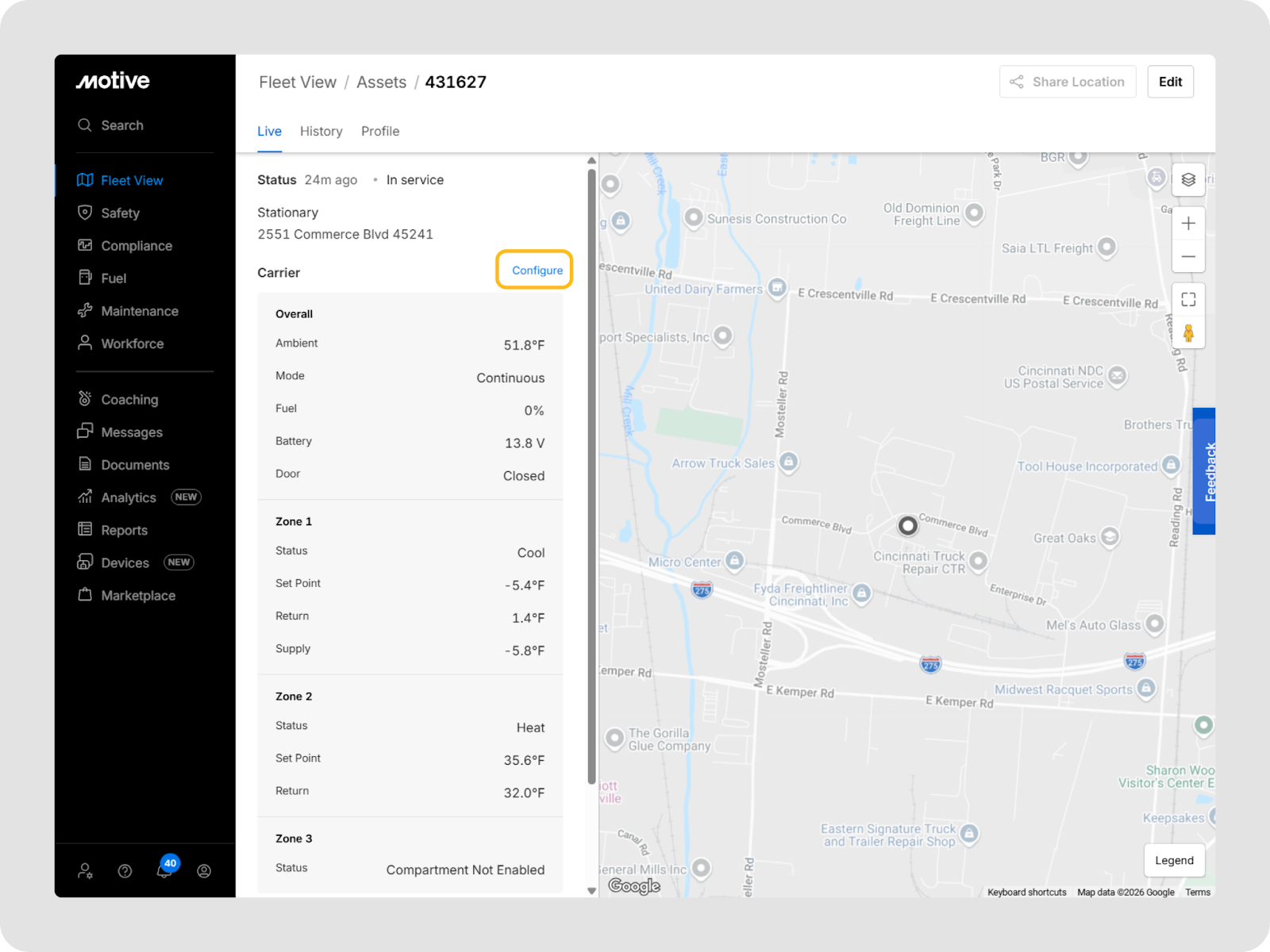 Reefer monitoring via Thermo King (TK) and Carrier API lets you connect OEM‑equipped refrigerated trailers directly to the Motive Fleet Dashboard, so you can see temperatures, alarms, and operating modes in real time, remotely control reefer settings, and generate audit‑ready reports without having to install additional hardware on supported units.