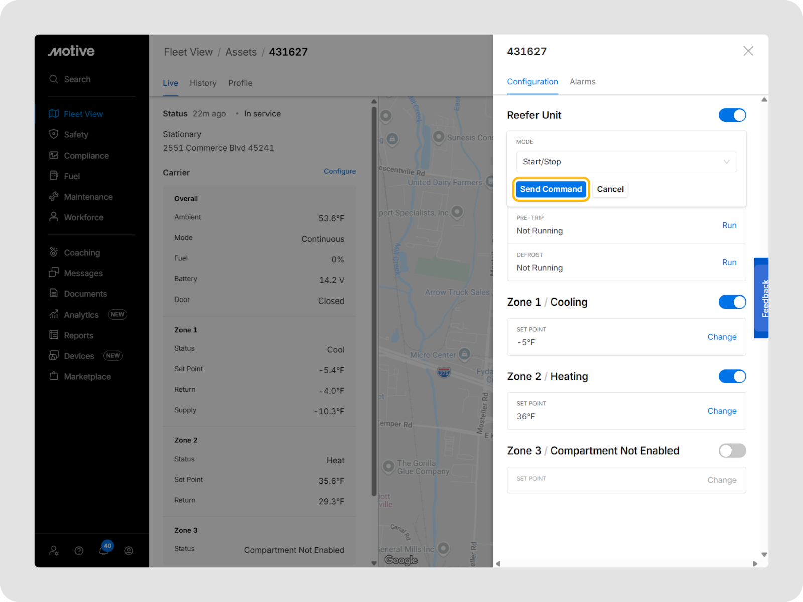 - From the Configure tab, enable or disable the toggle to turn a reefer on or off.