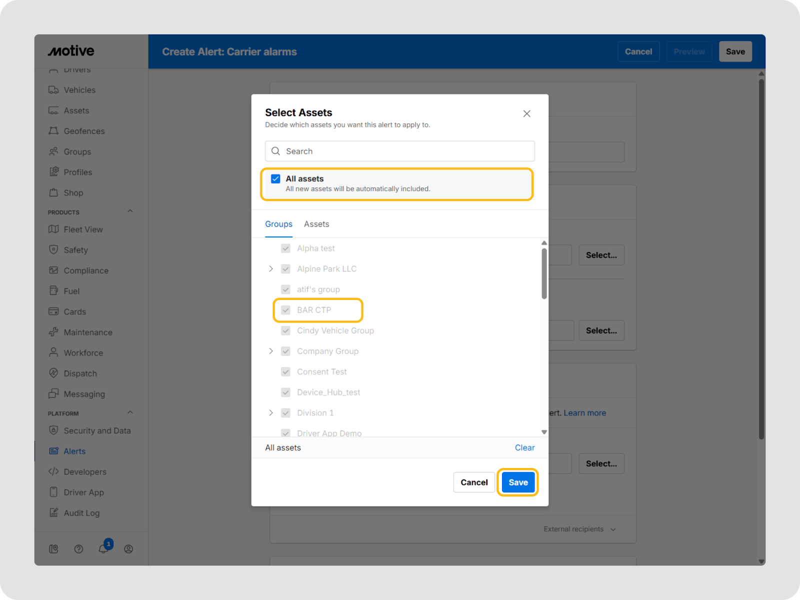 - From Recipients > Fleet users, click Select to choose which fleet users will be notified when this alert is triggered.