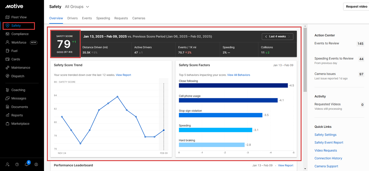 - The Safety Score includes unsafe driving behaviours captured by the Dashcam, as well as speeding and harsh driving.