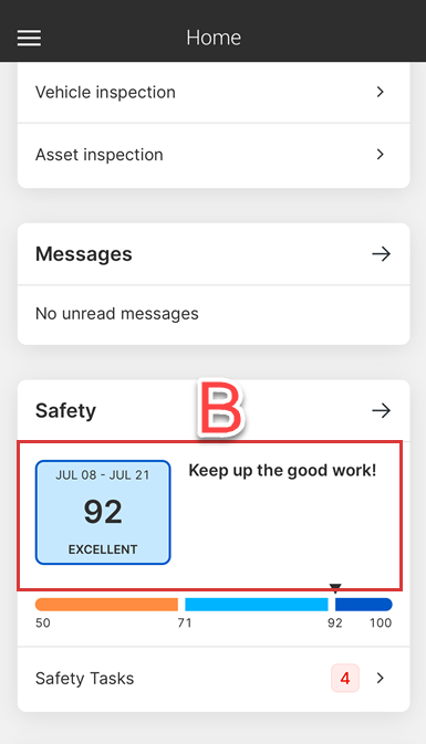3. Tapping the Safety section leads to the Safety Hub. The Safety Hub displays the Safety Score details and safety tasks to be reviewed.