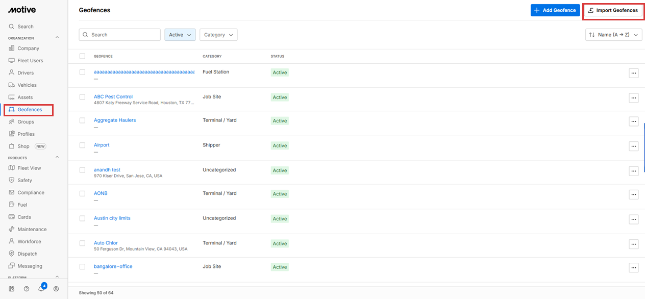 Fleet Admins set up geofences to alert Fleet Managers and external recipients about Drivers when they enter or exit a specific area. The following steps explain how multiple Geofences can be uploaded on the Fleet Dashboard.