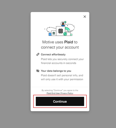 4. A prompt Motive uses Plaid to link bank accounts appears. Click on Continue.