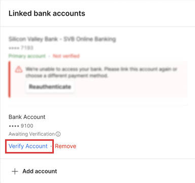 It can take up to 24 - 48 hours for the deposit to reflect on your Bank Account. Once you can find the deposit, you can navigate back to your ‘linked bank accounts’ section in the dashboard to ‘verify account’. Click Verify account.