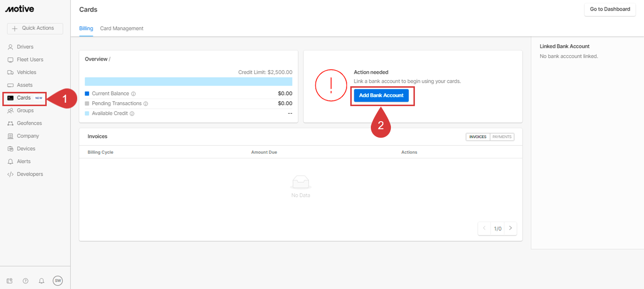 Motive cards can only be paid with a Bank Account. There is No option to use a Debit or any other cards to pay Motive Card Balance. Fleet Admins can link bank accounts to Motive cards through Fleet Dashboard.