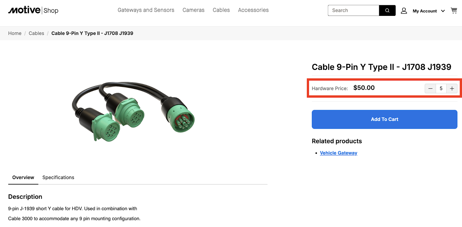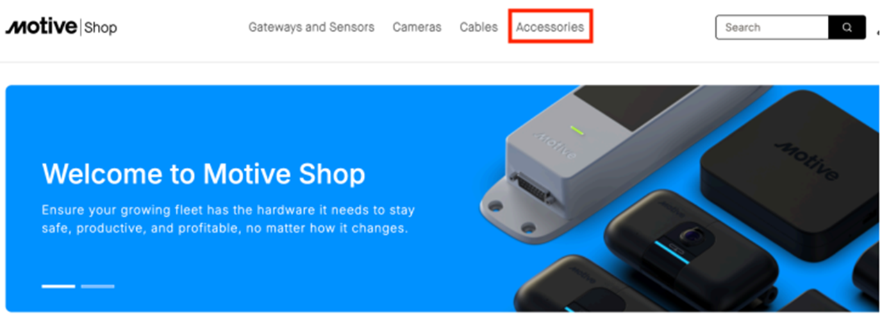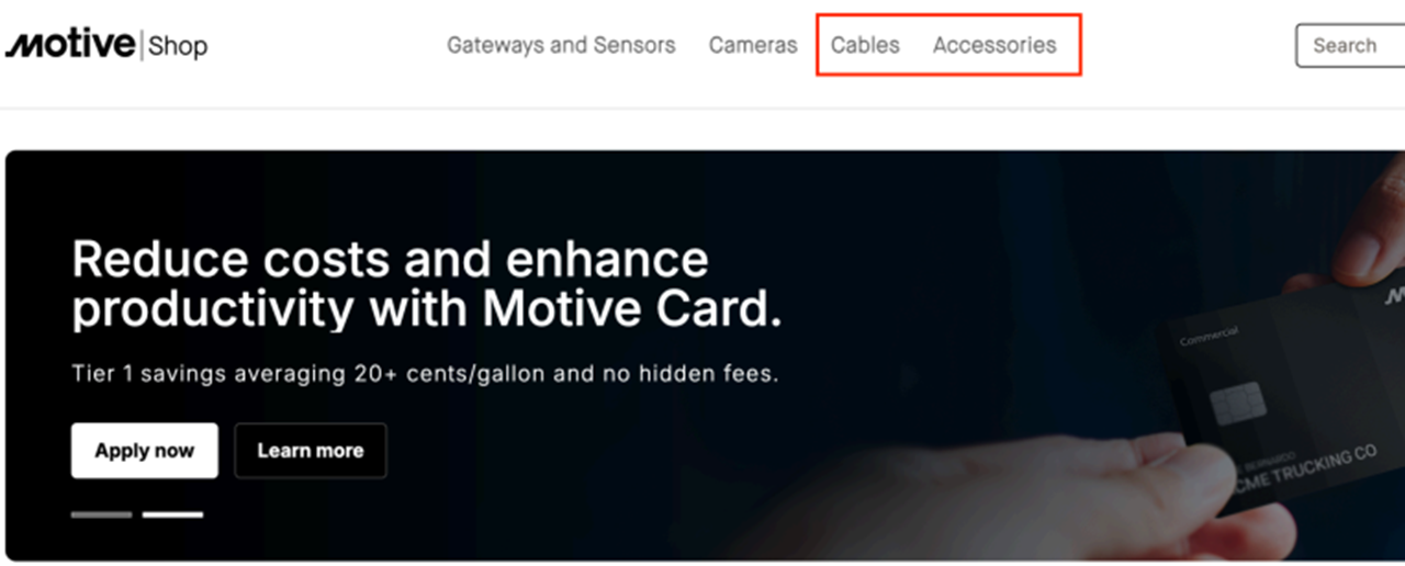 The Motive Shop is Motive’s e-commerce platform that enables Fleet Admins to self-serve orders for additional product bundles, cables, and accessories in a few clicks. Fleets can purchase the products they have already bought from Motive, in addition to calling the cables and accessories. Also, the Motive Shop is accessible to Fleet Admins by default.