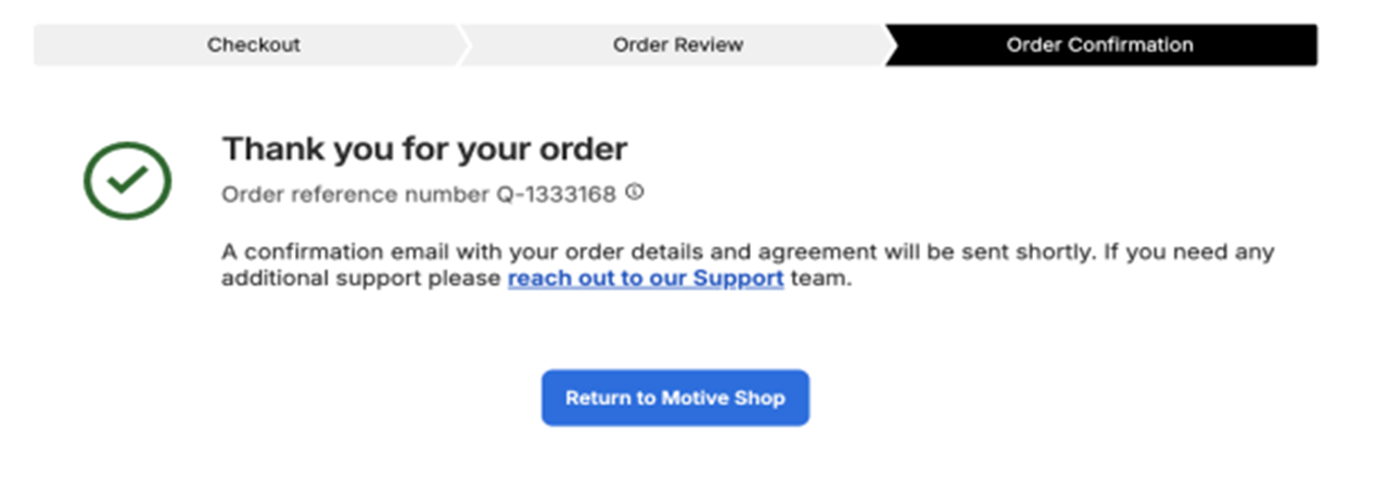 17. You are directed to the Order Confirmation screen, confirming that your order has been received by Motive.