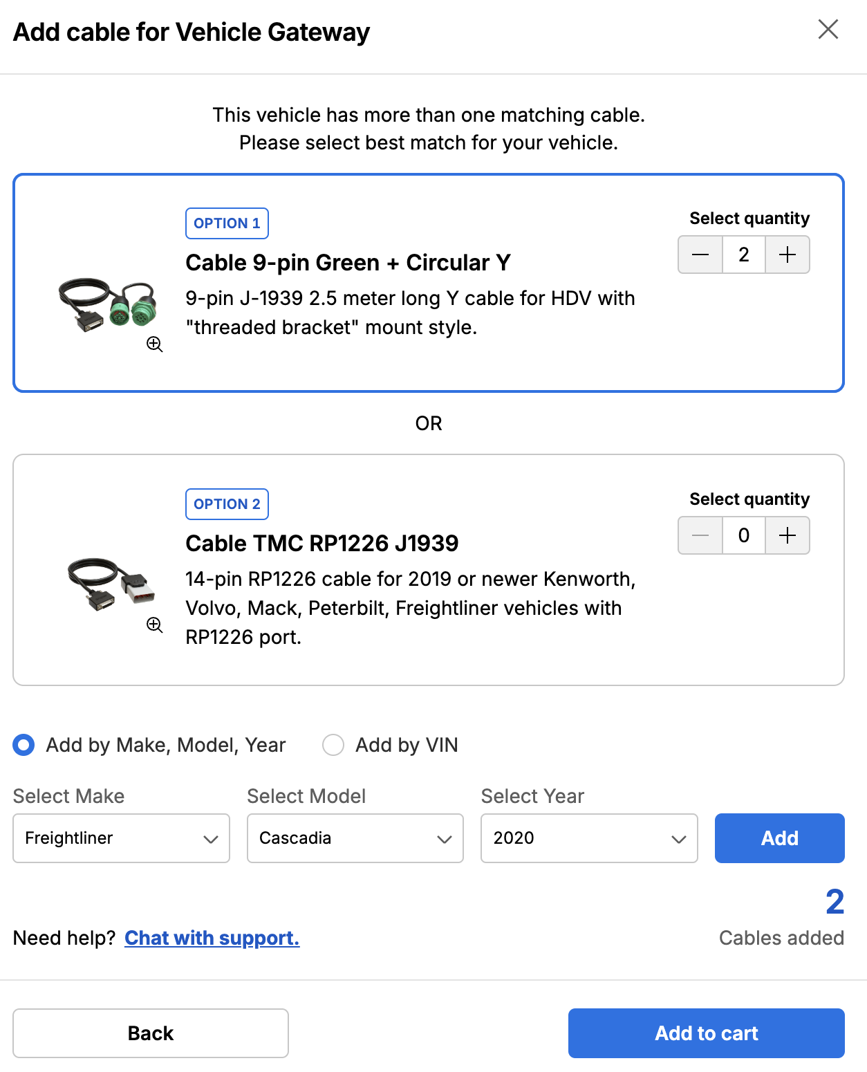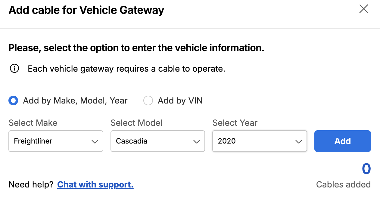 3. A cable selector window pops- up as shown below. Enter your vehicle information by Make, Model, Year, or VIN. Click Add.