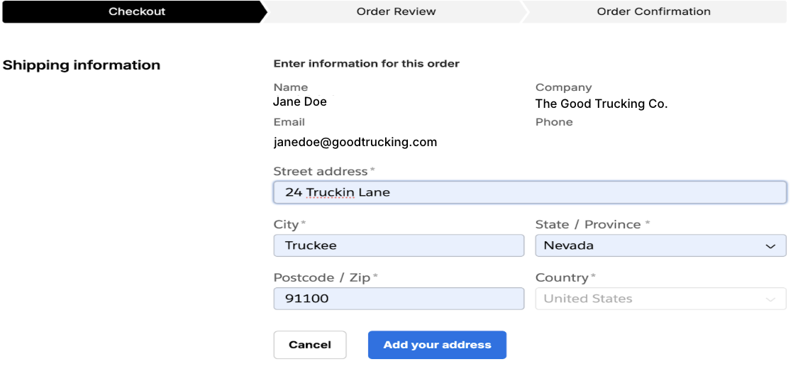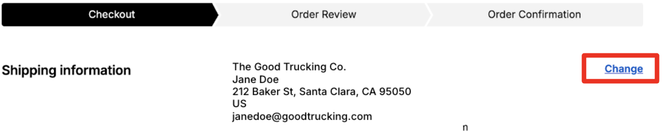 - Shipping Information: By default, the shipping address is the billing address on the account. Change it and provide a one-time shipping address for the current order.