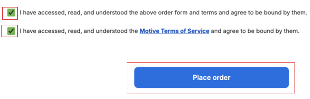16. Check both boxes, then click Place Order to submit your order to Motive.