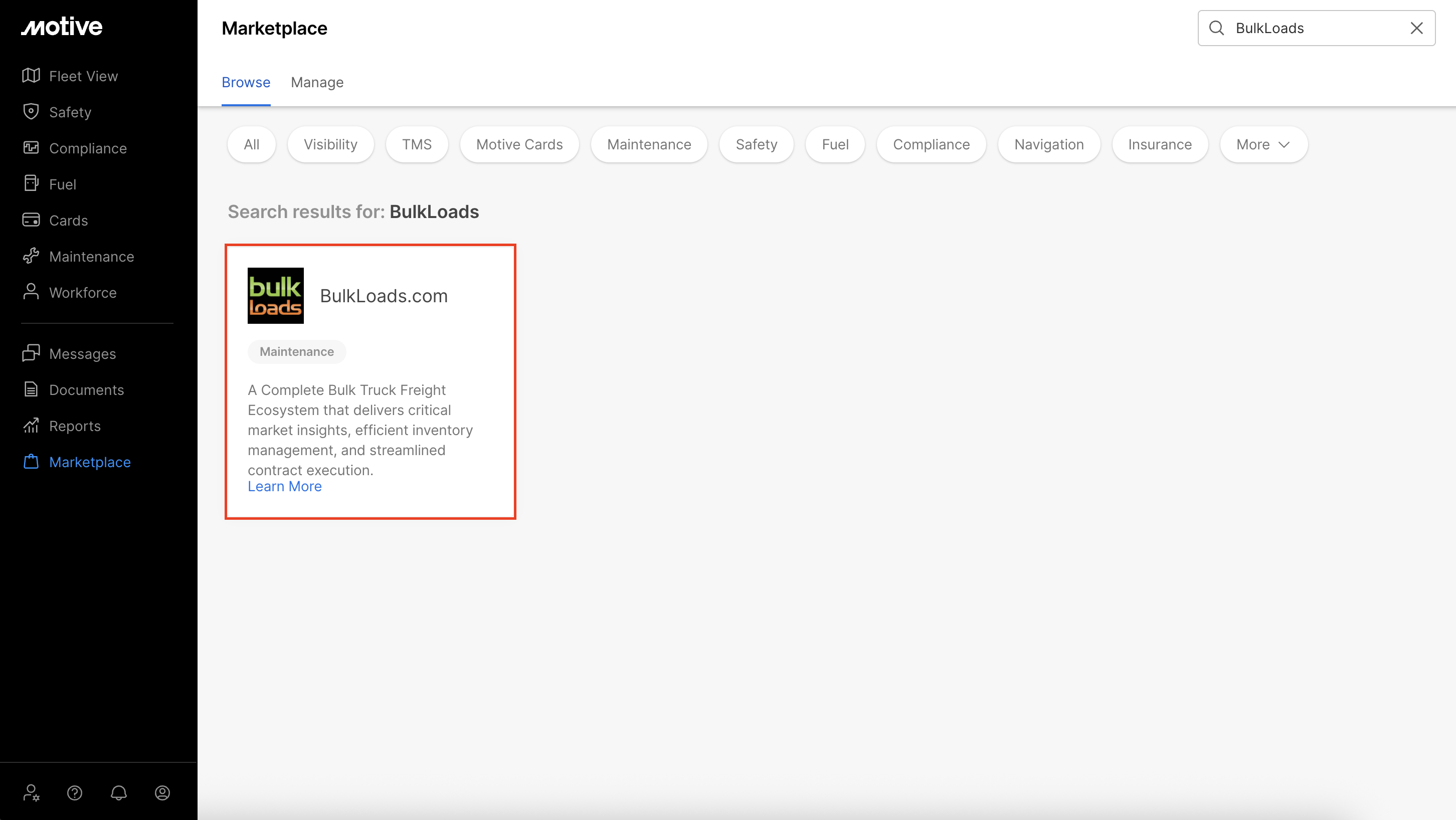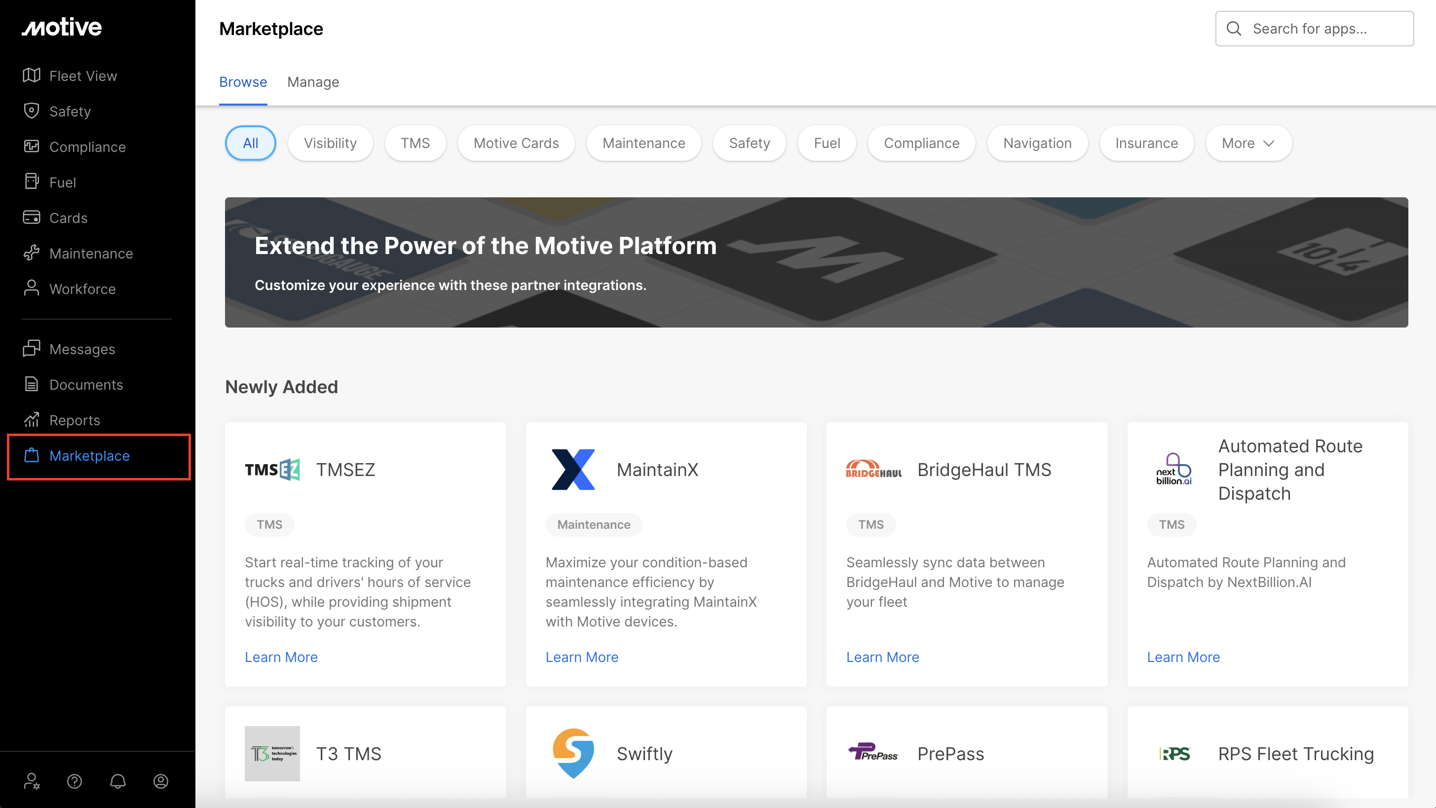 1.Log in to the Motive Fleet Dashboard and click Marketplace.