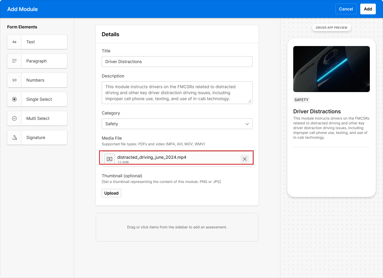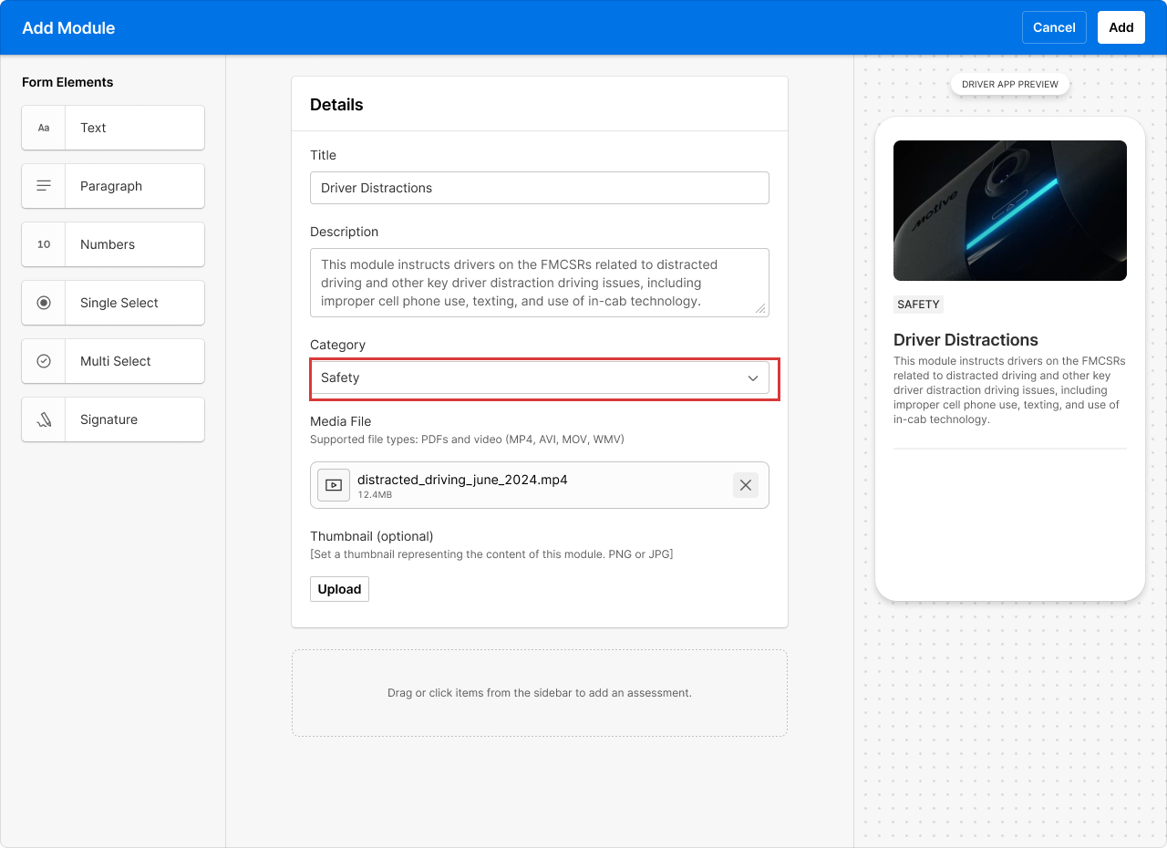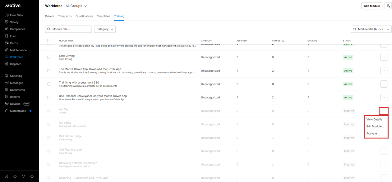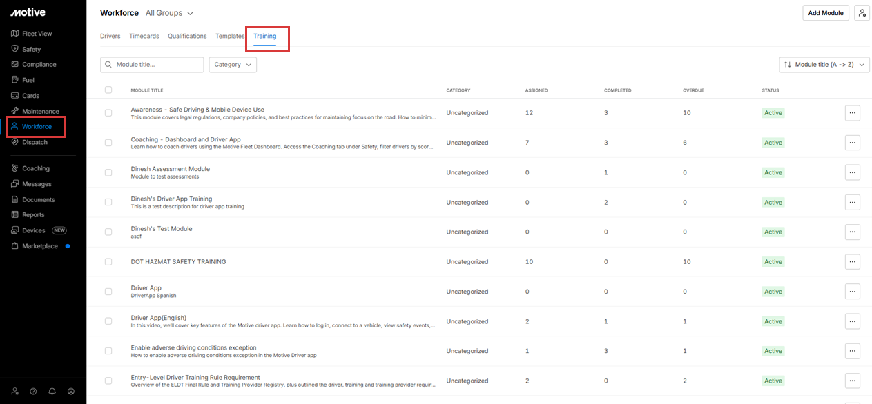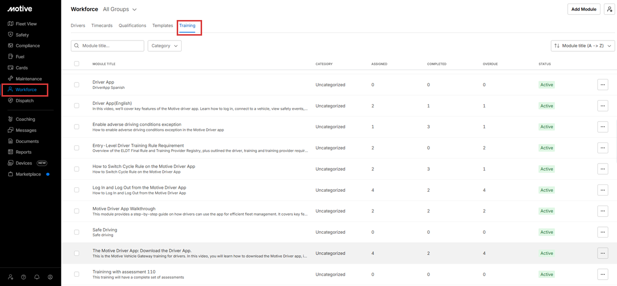 The Training module in Motive’s Workforce Management helps fleets deliver and track driver training in one place. Instead of using separate tools or manual tracking, fleets can now upload content, assign training, and monitor progress directly in the Motive platform.