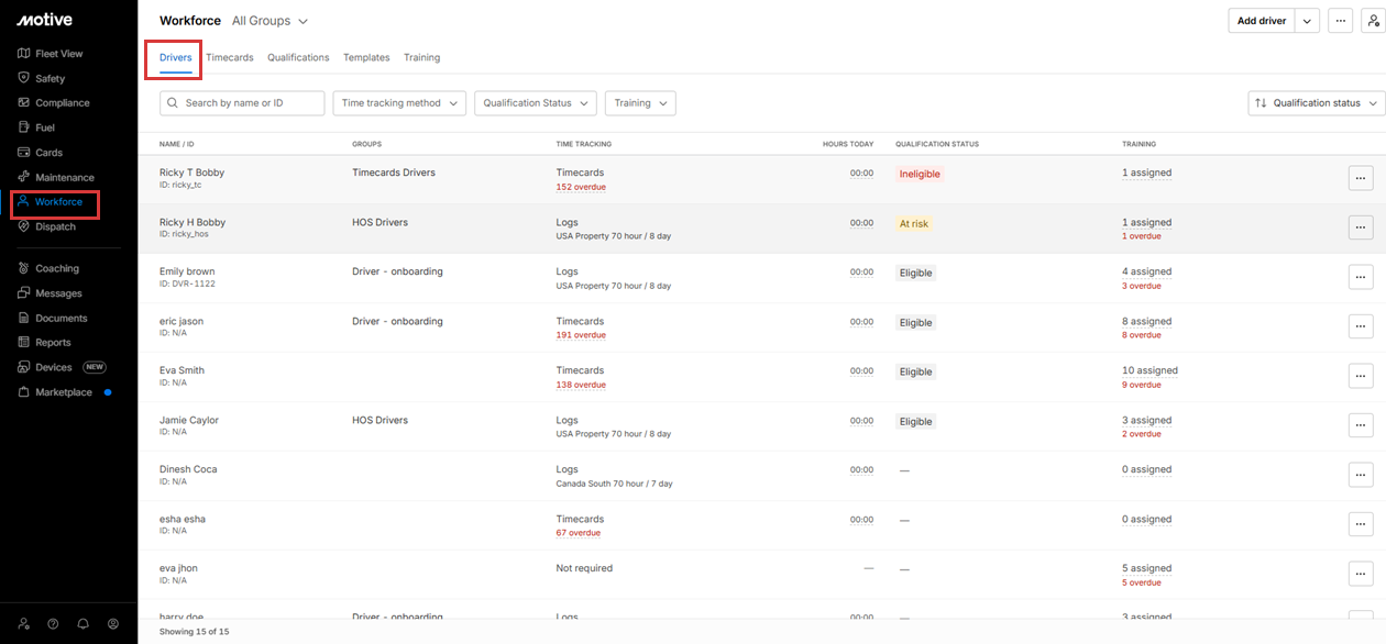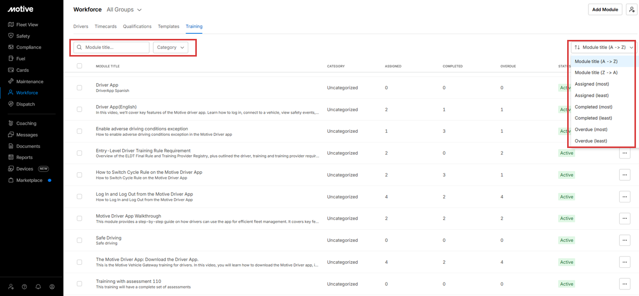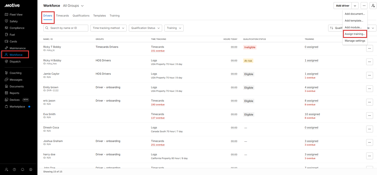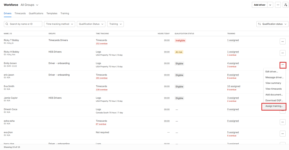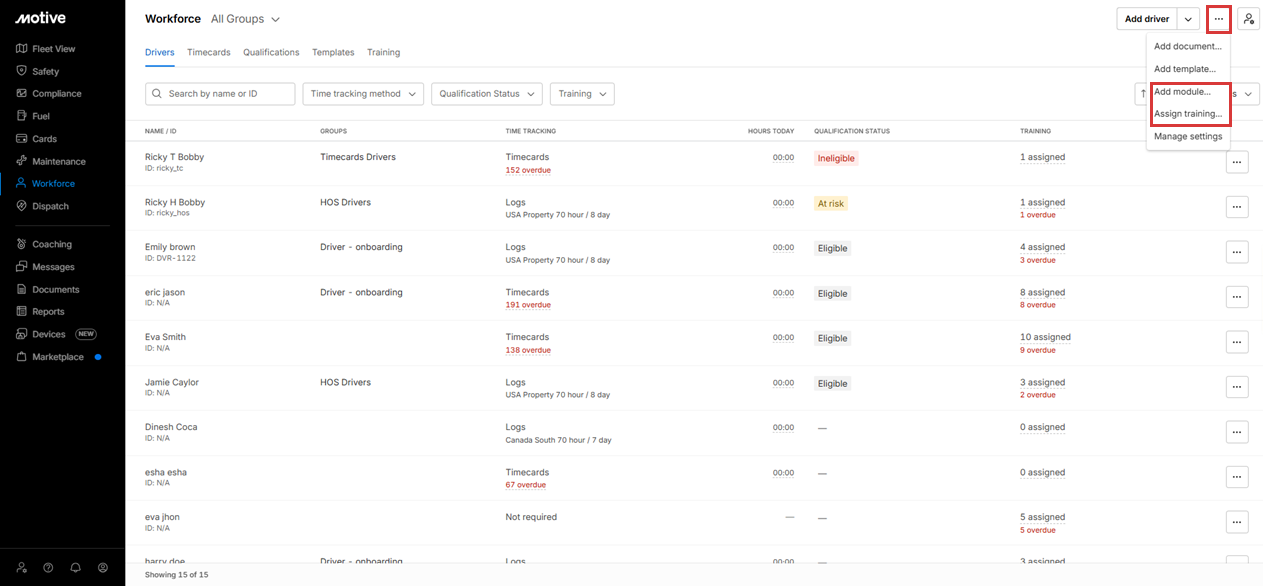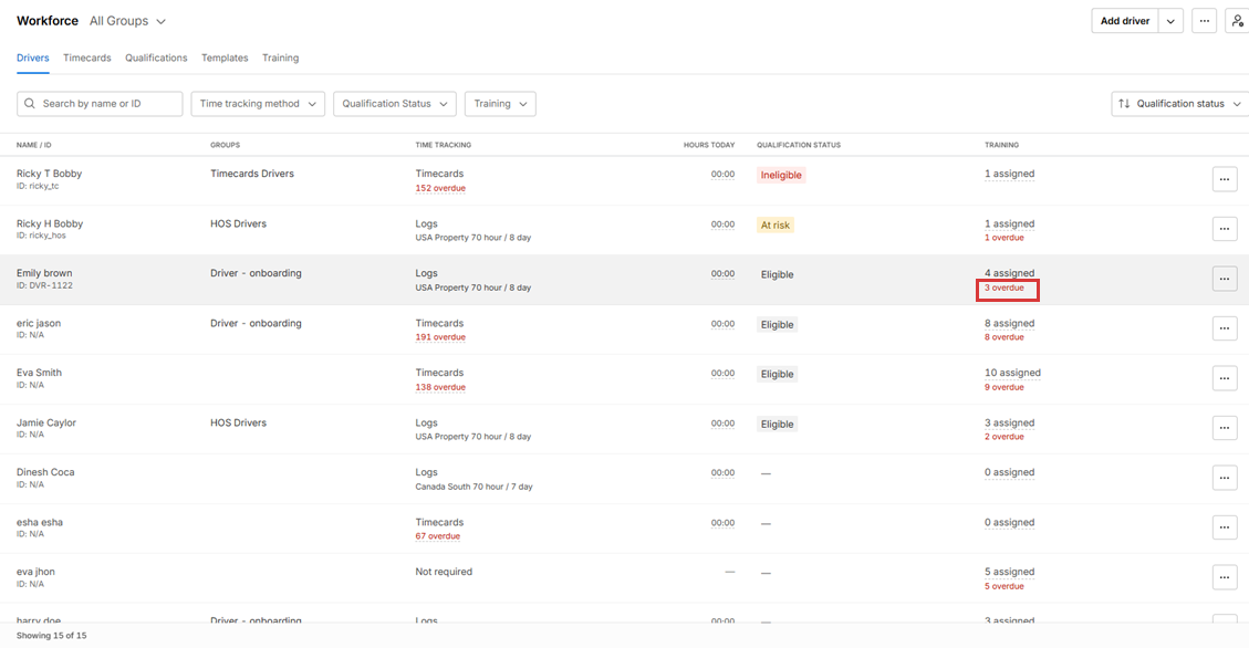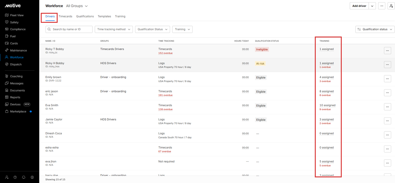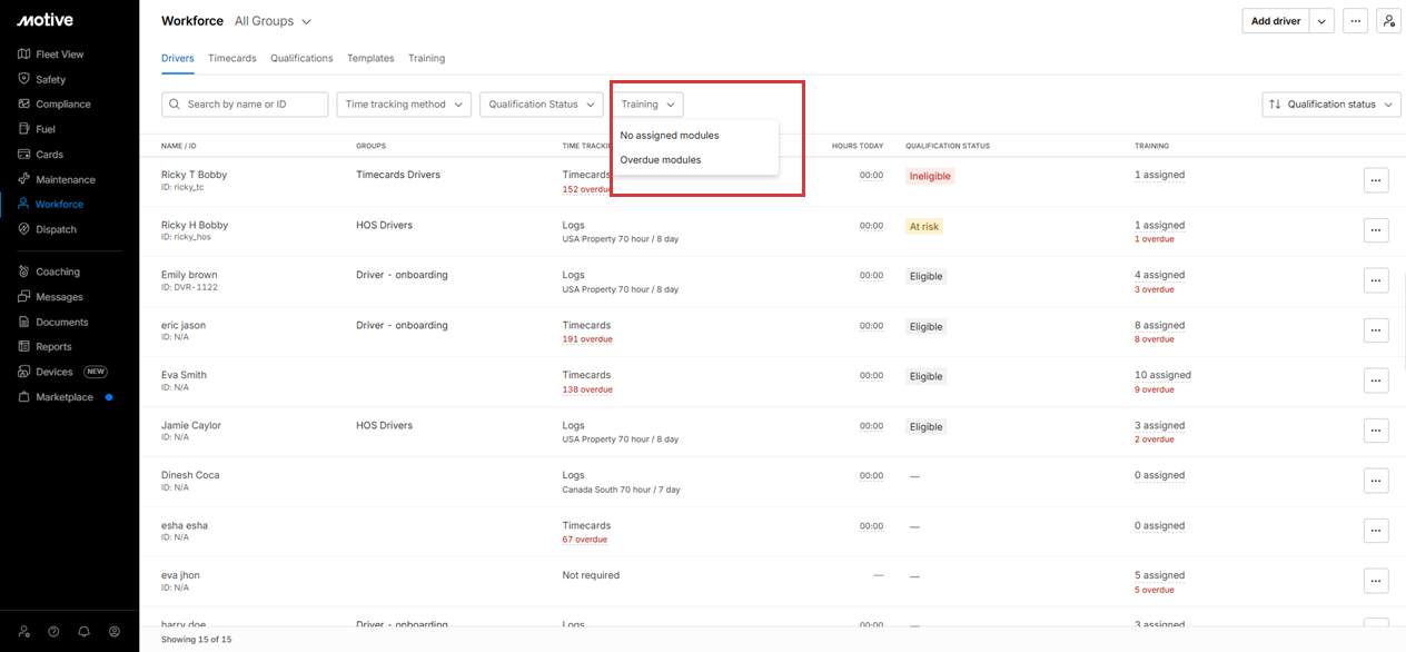 A Training filter is available on the page to quickly view drivers based on unassigned or overdue training.