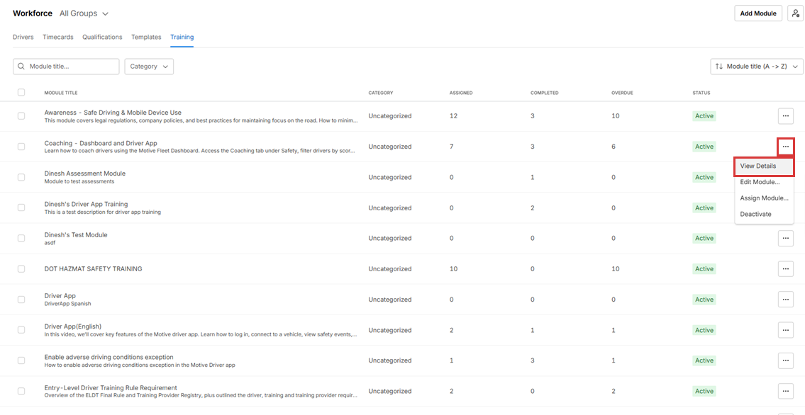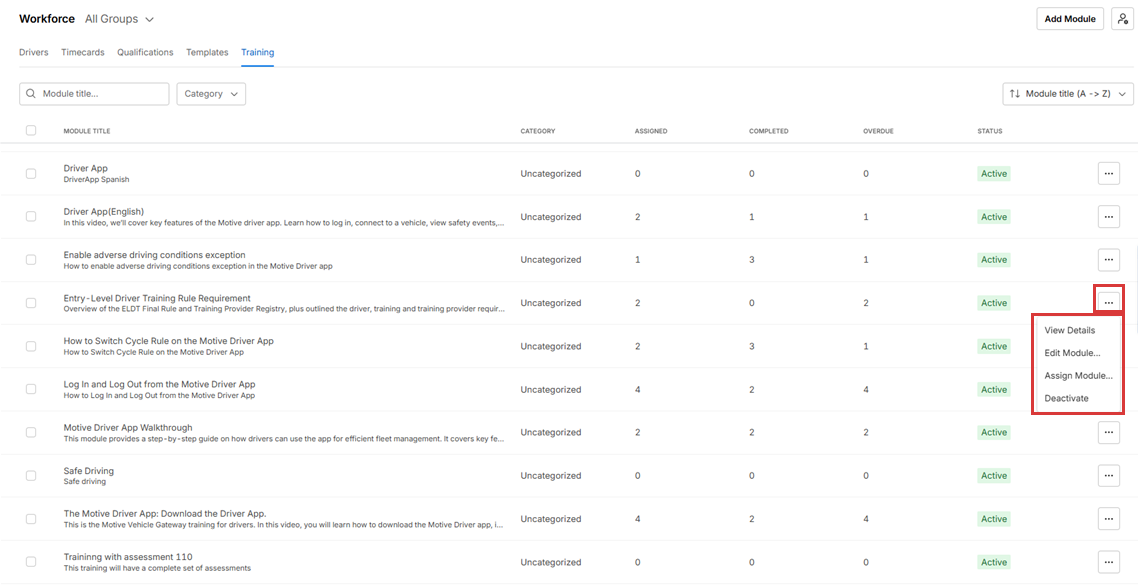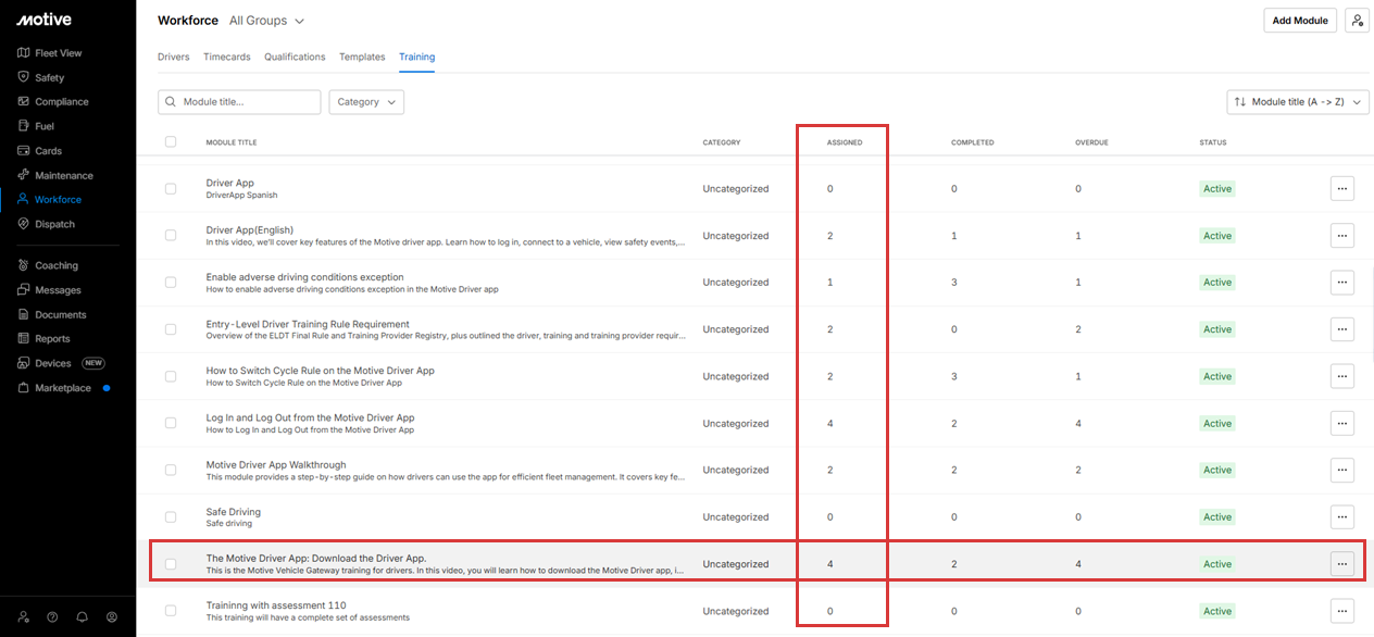 - The assigned column shows the number of drivers who haven’t completed the module