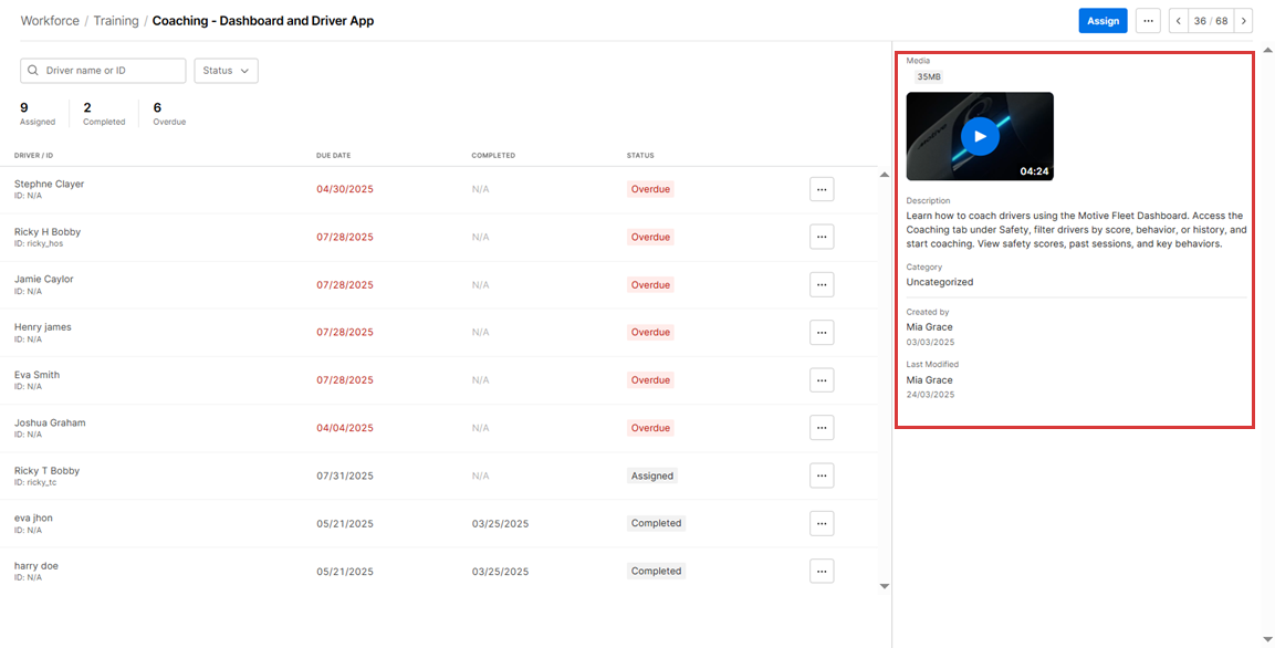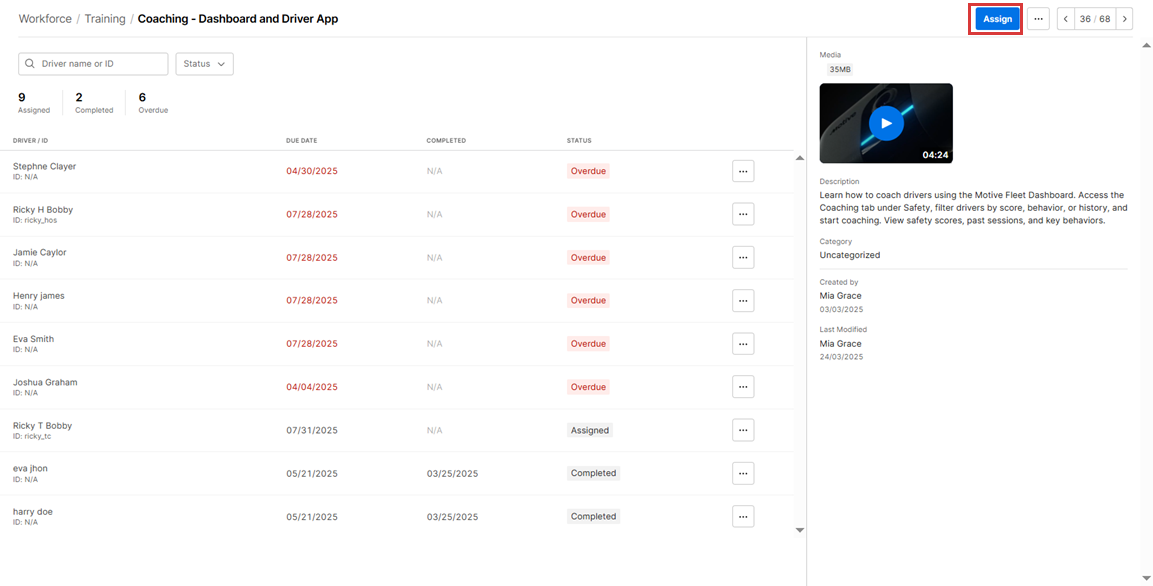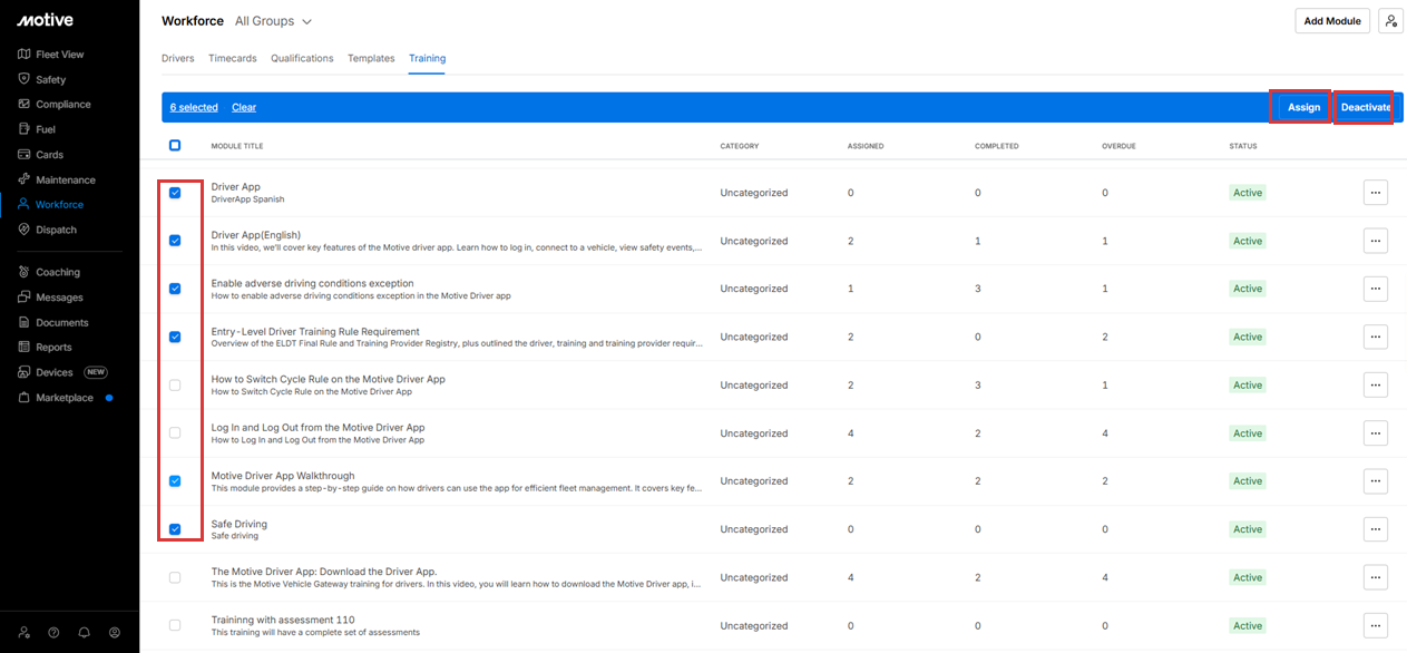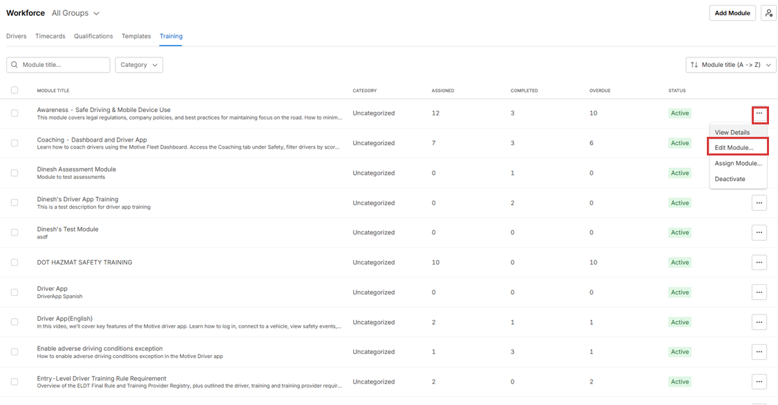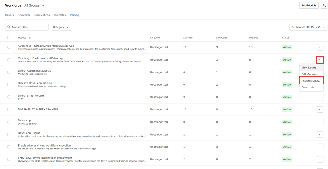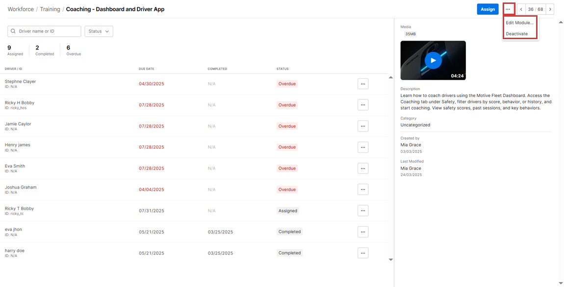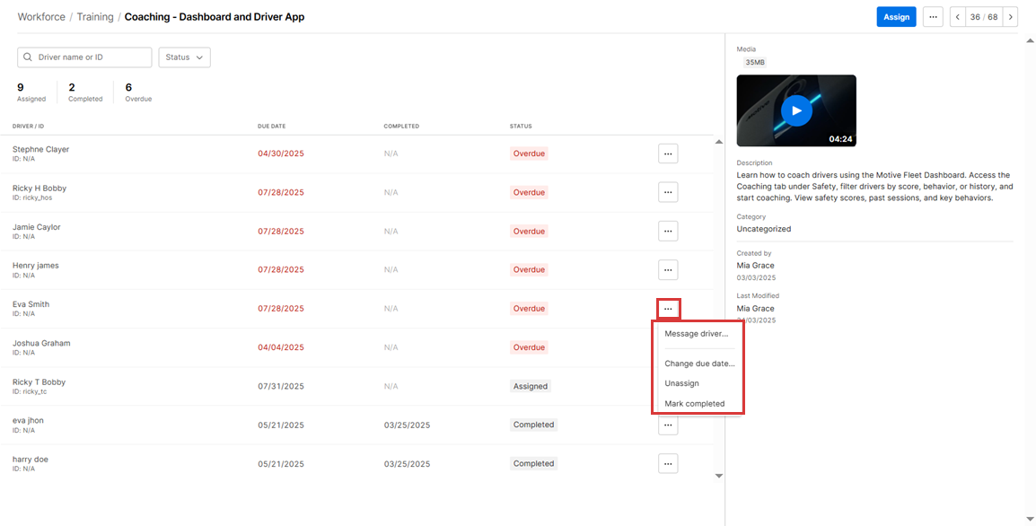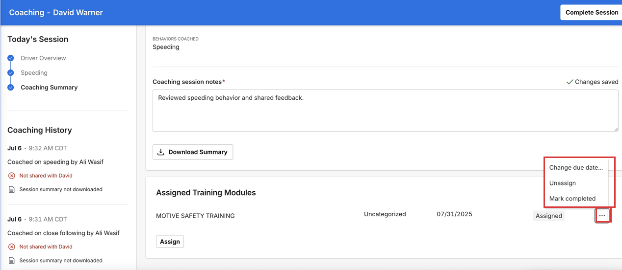 8. Under Assigned Training Modules, Fleet Managers can review the modules currently assigned to the Driver and take actions such as Change due date, Unassign, or Mark completed.