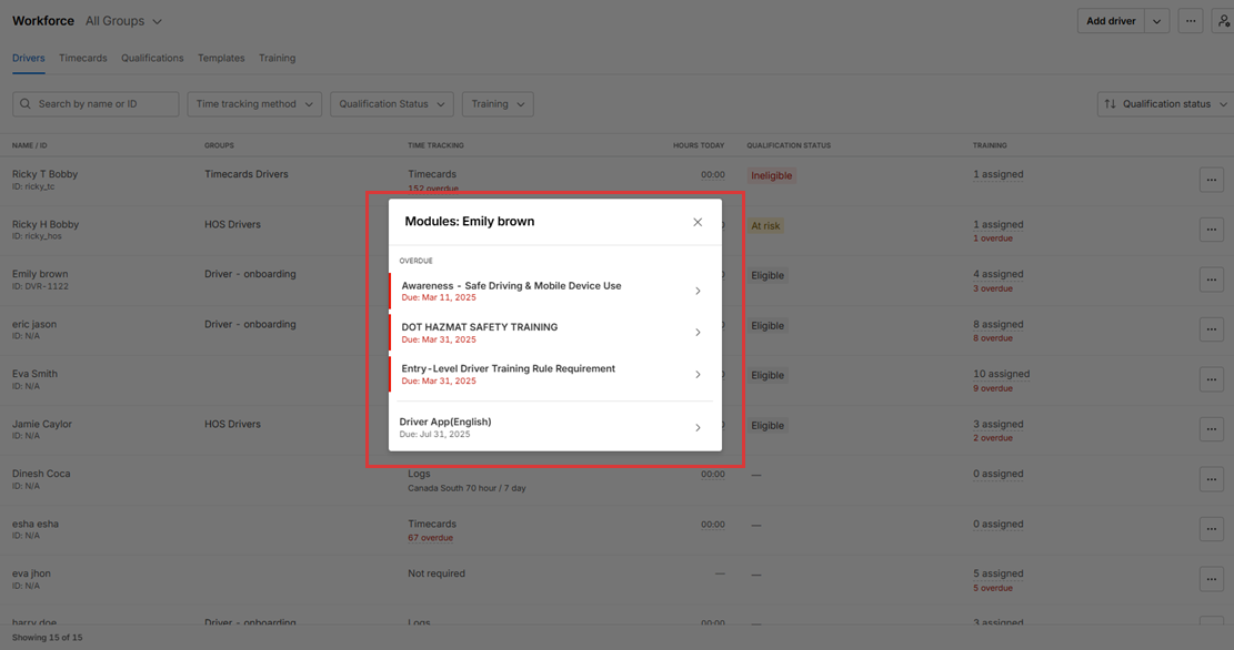 - A Training column shows the number of modules assigned to each driver.