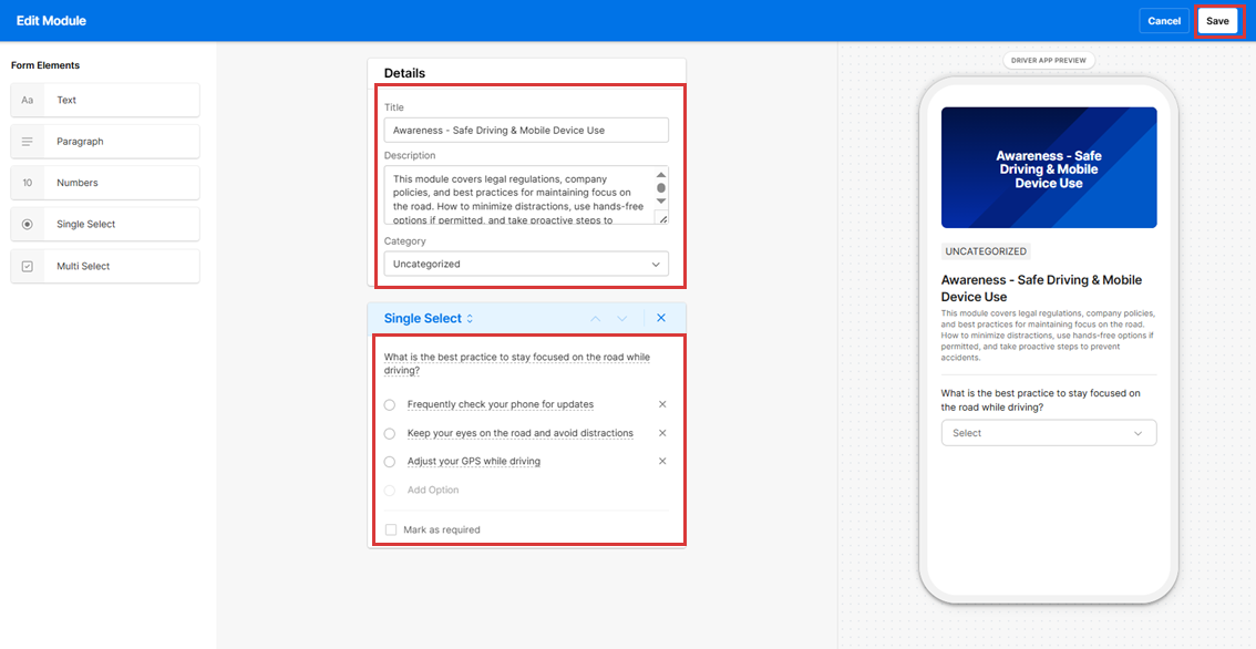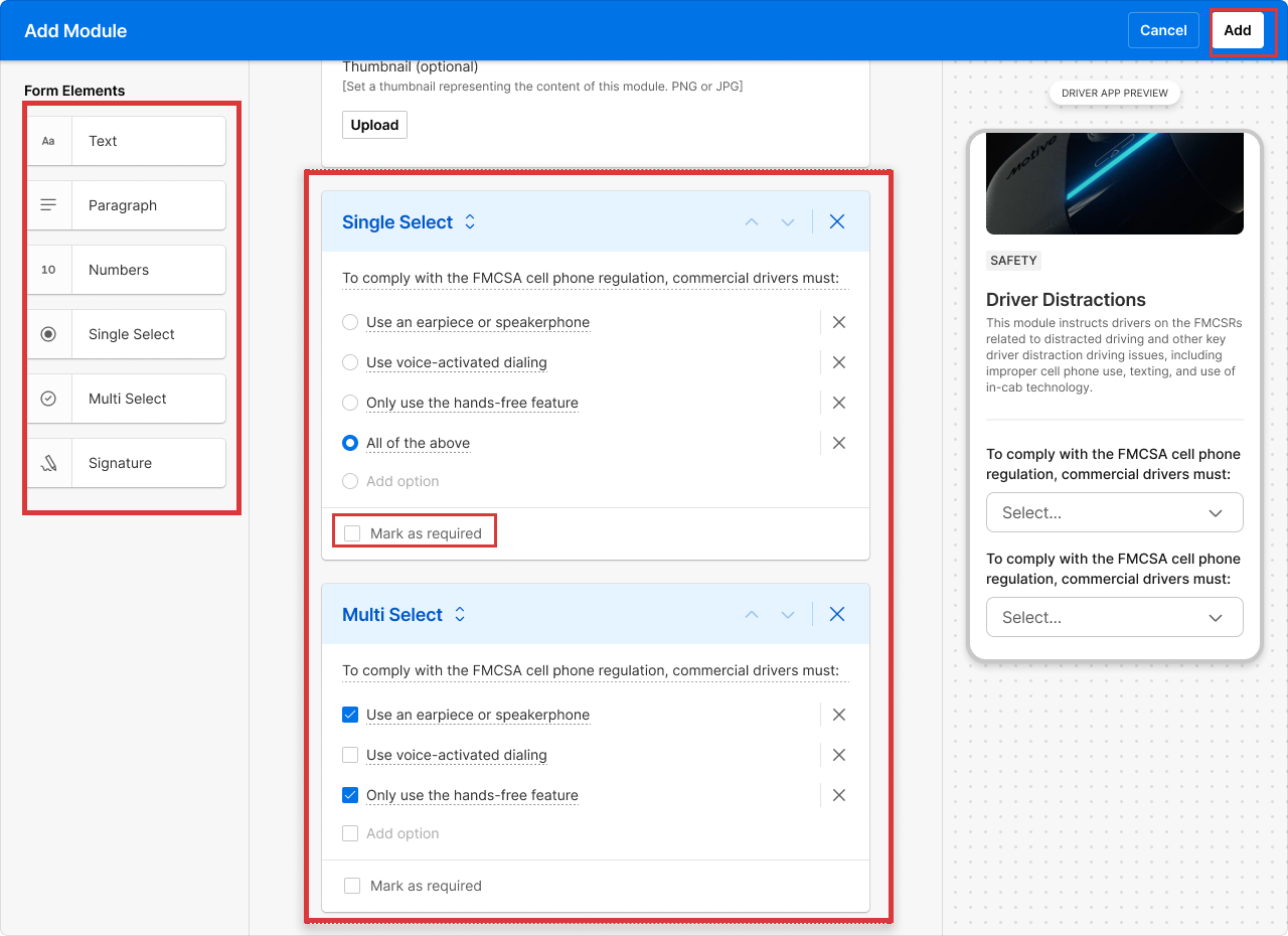 8. Fleet Managers can select single or multiple select options based on the requirement. Click Mark as required to make it compulsory for Drivers to do the assessment.