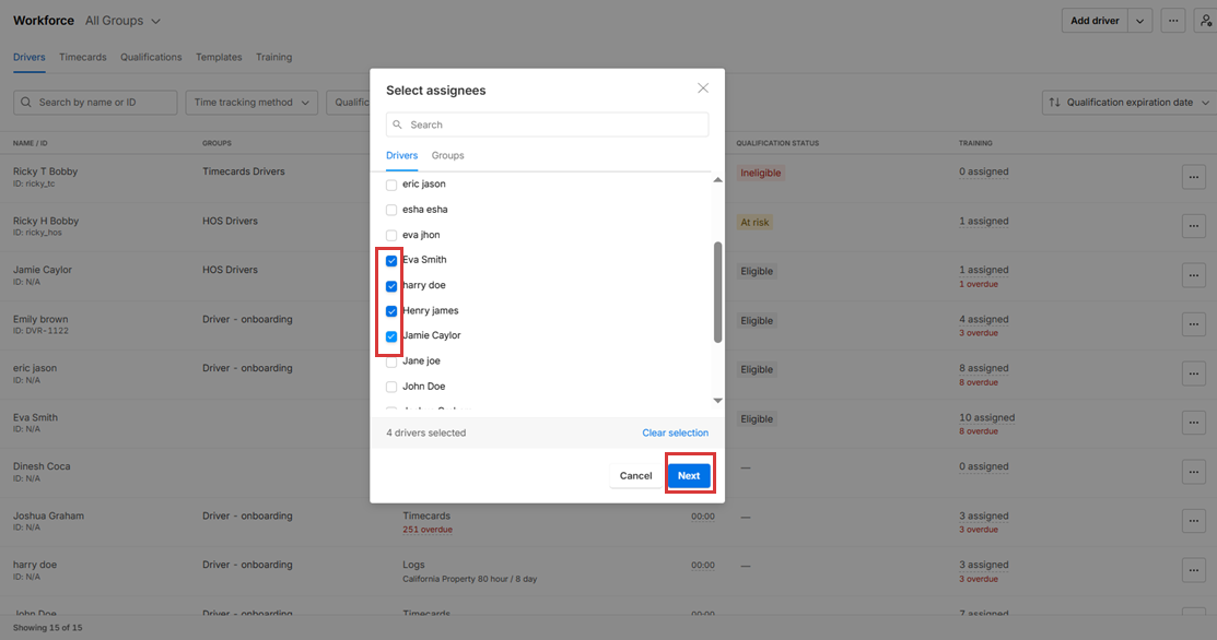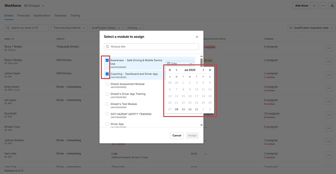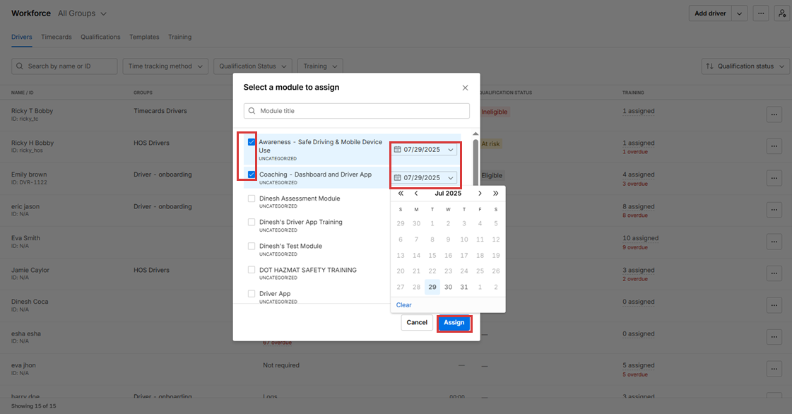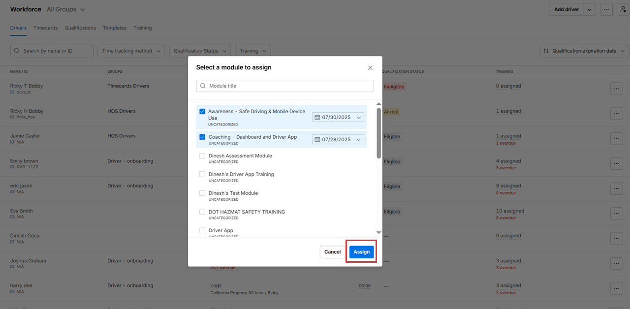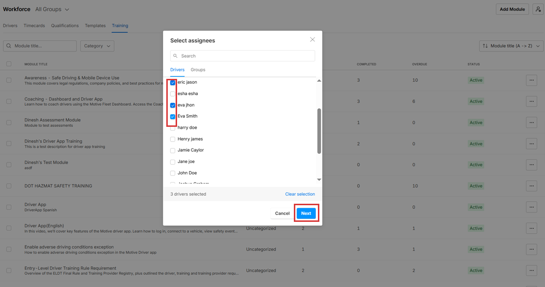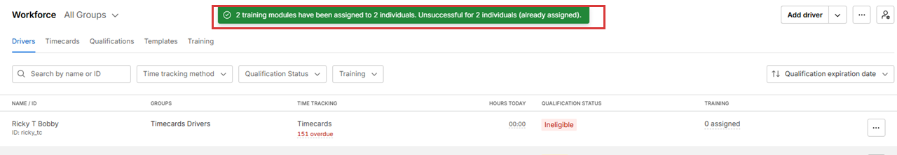 7. The selected drivers are assigned the training module.
