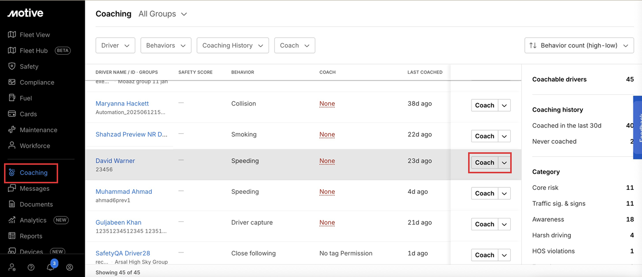 4. Click Coaching to review the behavior.