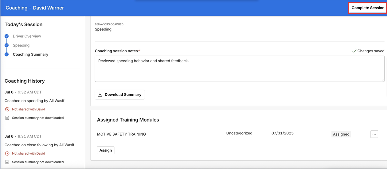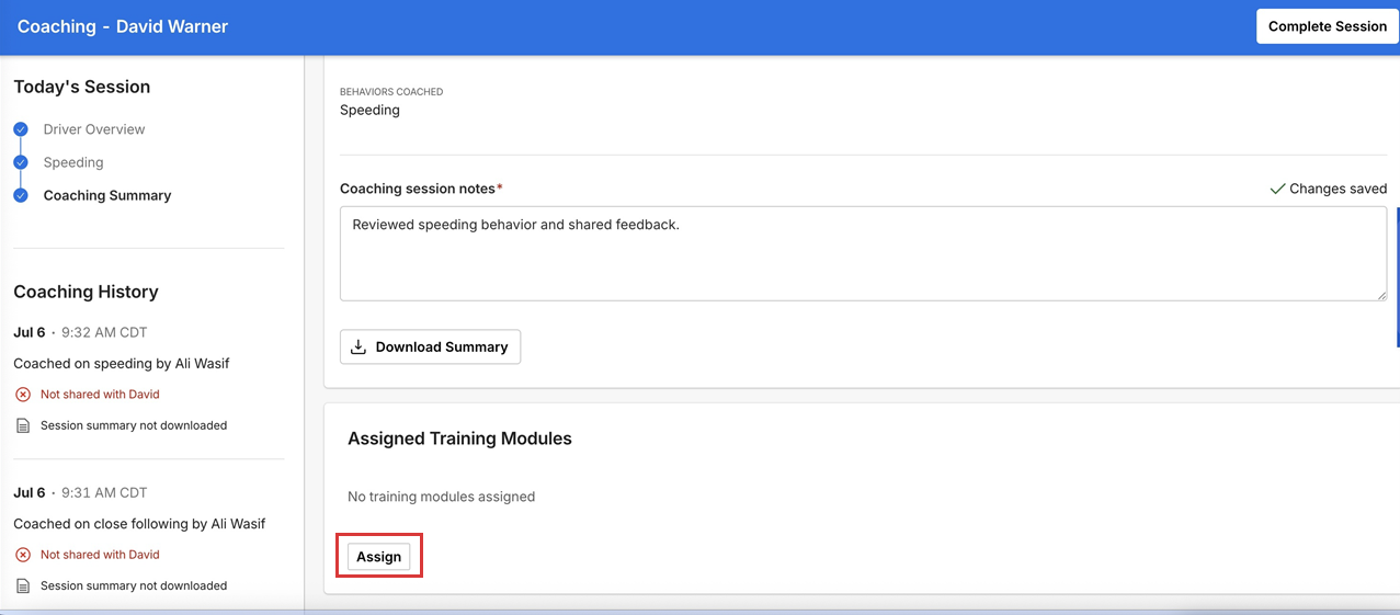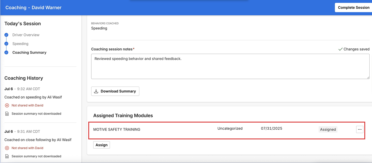 Assign training modules from Coaching Summary