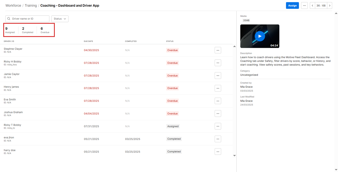 5. At the top, a summary displays the total number of Assigned, Completed, and Overdue drivers for the module.