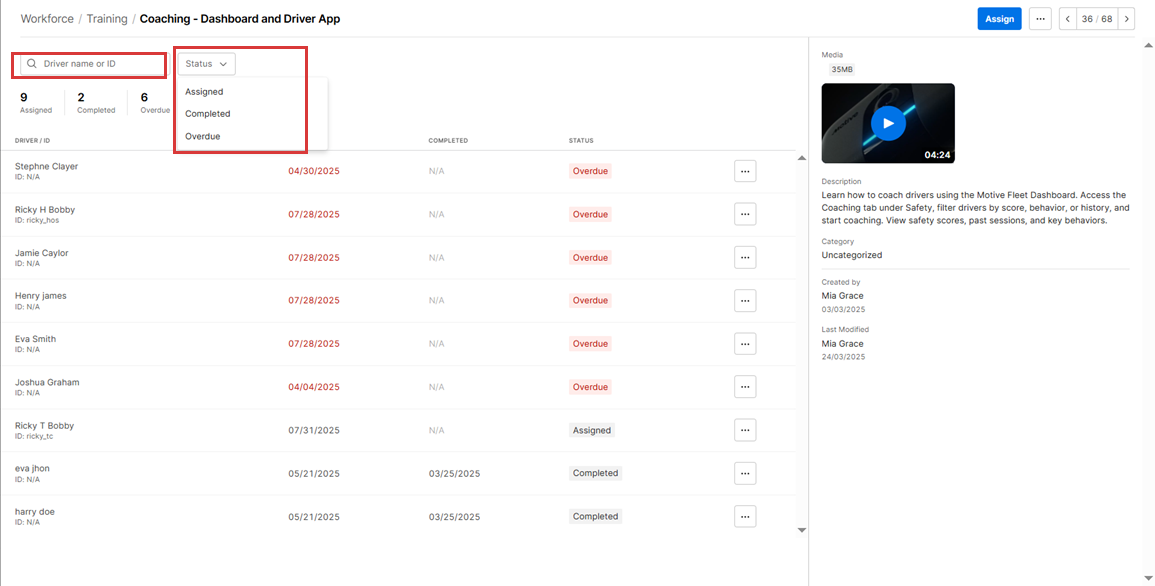 6. The module view also shows a list of drivers assigned to it, along with their Status, Due date, and Completion date. The list can be searched by Driver and filtered by Status to quickly view specific groups.
