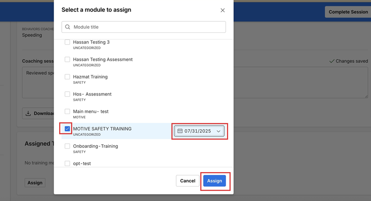 6. Select a module from the list, choose the due date, and click Assign.