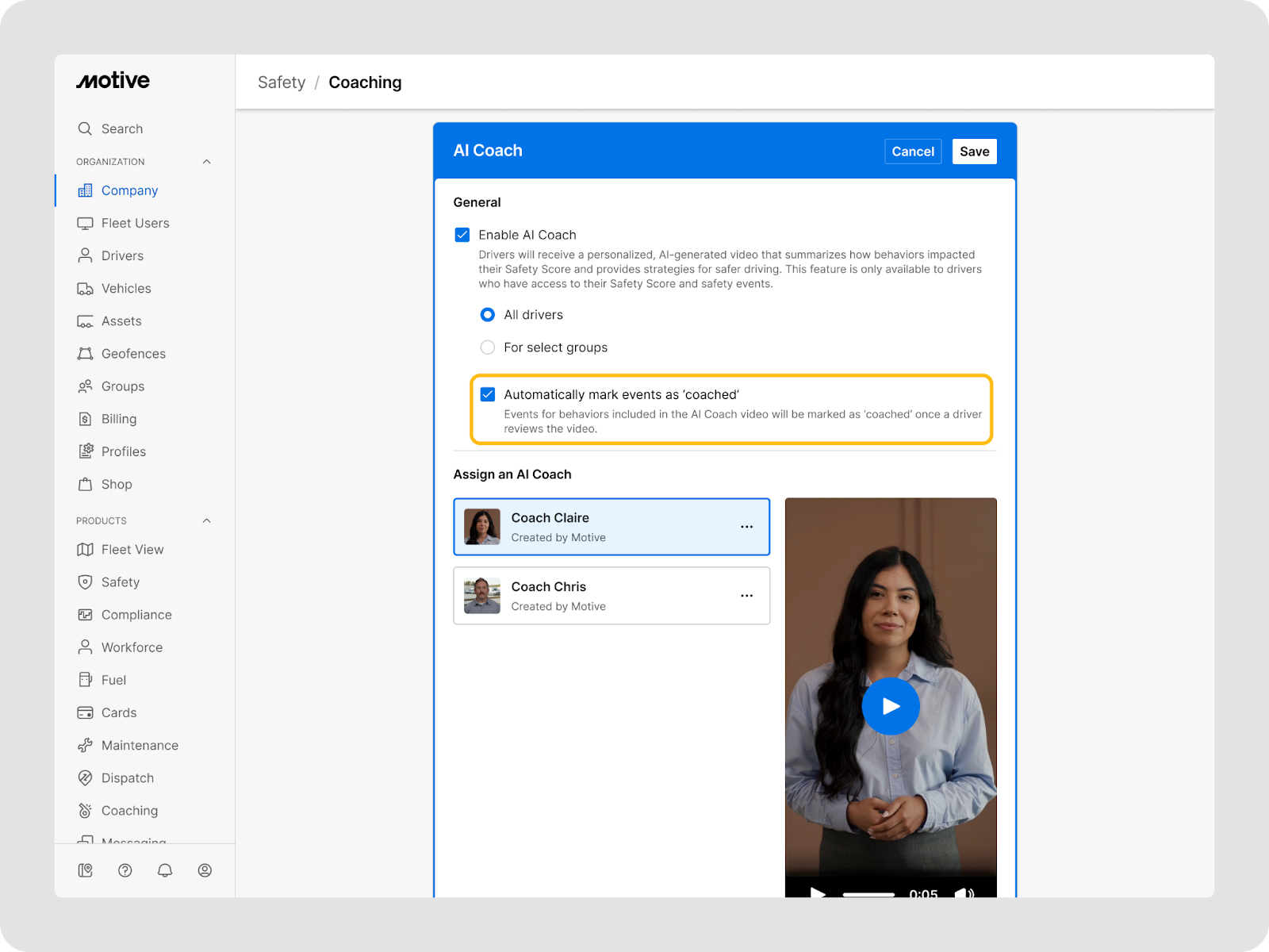 - Automatic coaching status updates: Safety events are automatically marked as coached once a driver reviews their AI Coach video, reducing manual follow‑up and keeping coaching records up to date. This feature is enabled by default and can easily be disabled.