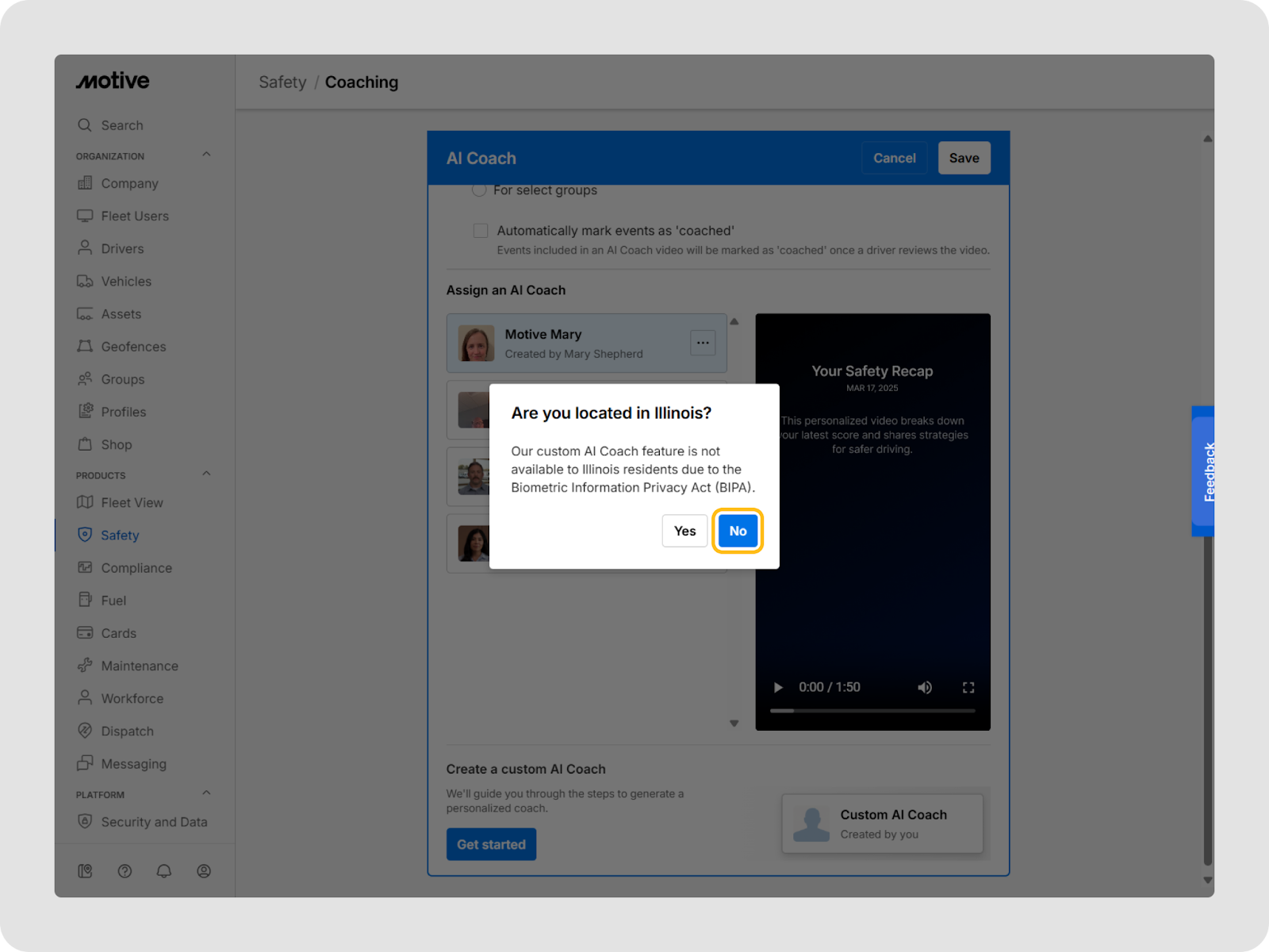 - Standard and custom AI Coaches: Choose from a list of standard AI Coach avatars or create a custom AI Coach avatar that reflects your own safety leader or brand, so drivers see a familiar coach delivering their weekly recap.