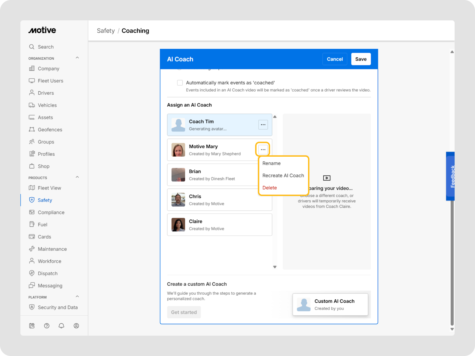 From the Fleet Dashboard’s Safety settings, go to Coaching > AI Coach, and you can browse available coaches, watch their preview videos, and select the avatar you want for your AI coaching videos. For detailed steps, see the Assigning AI Coach section in this article.