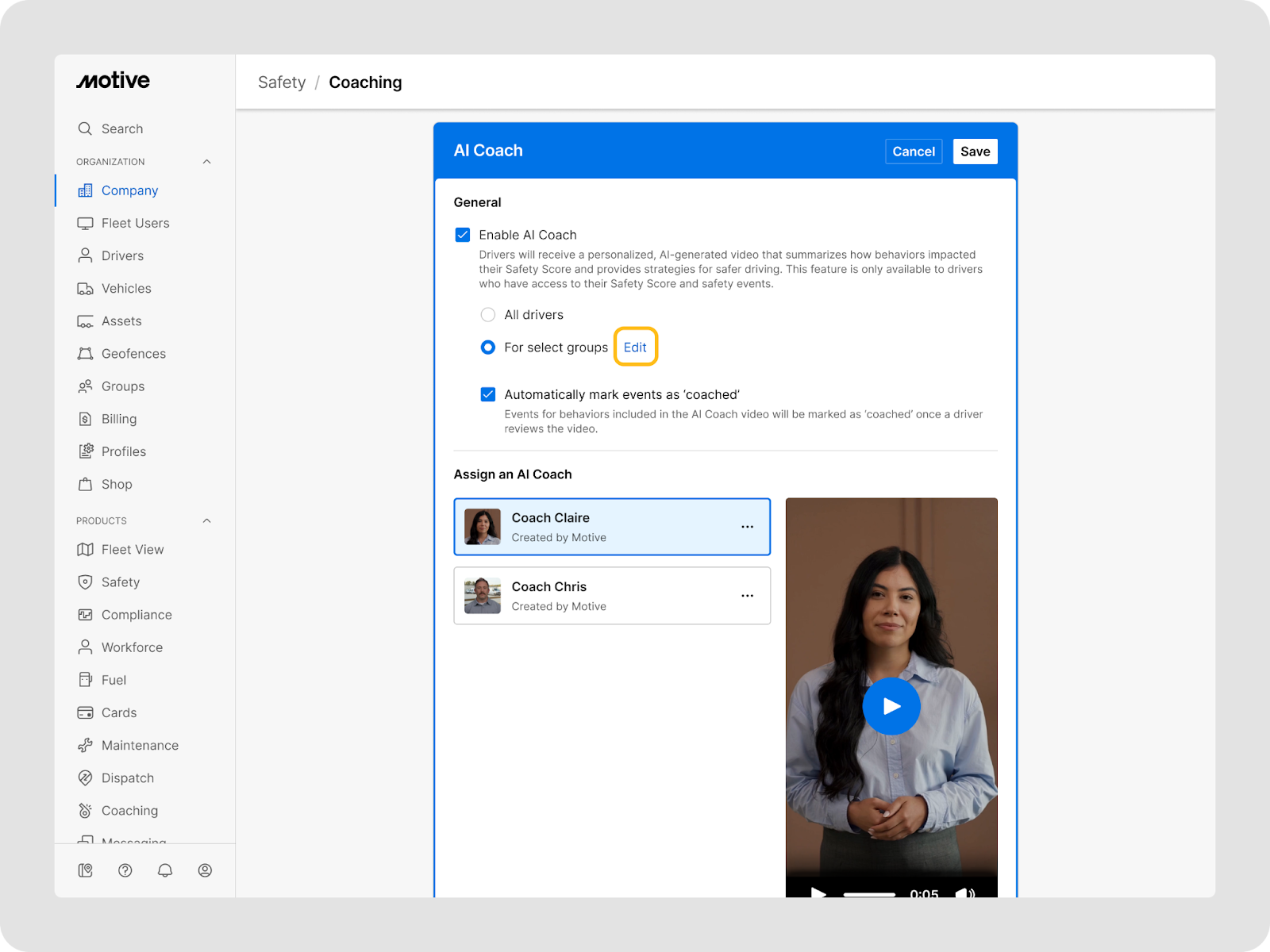 If a driver is in multiple groups and at least one of those groups has AI Coach enabled, that driver will still receive AI Coach video recaps. This ensures drivers are not missed when you roll out AI Coach by group.