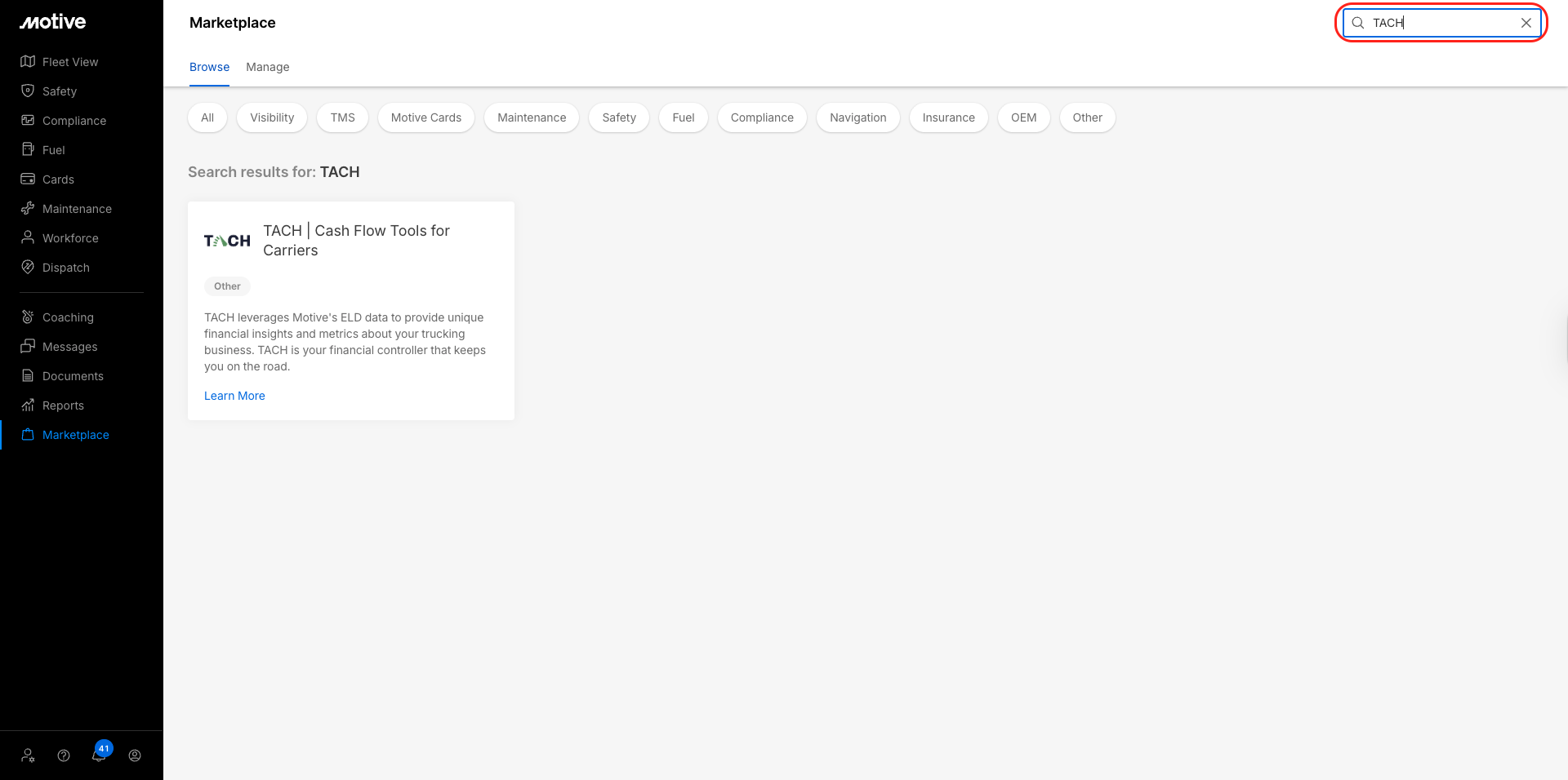 Log in to the Motive Fleet Dashboard and click Marketplace.