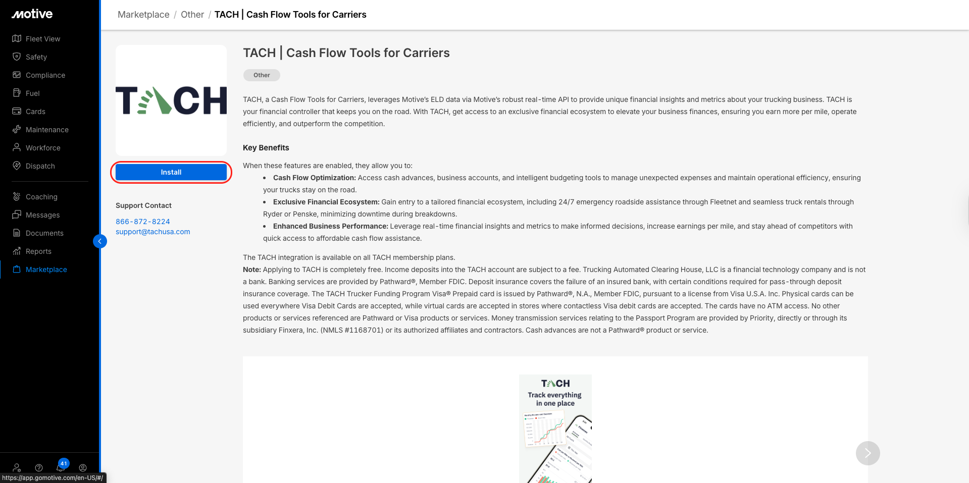 | Note: Click the Install button on the Motive standalone marketplace. The integration process is triggered on TACH's ends |